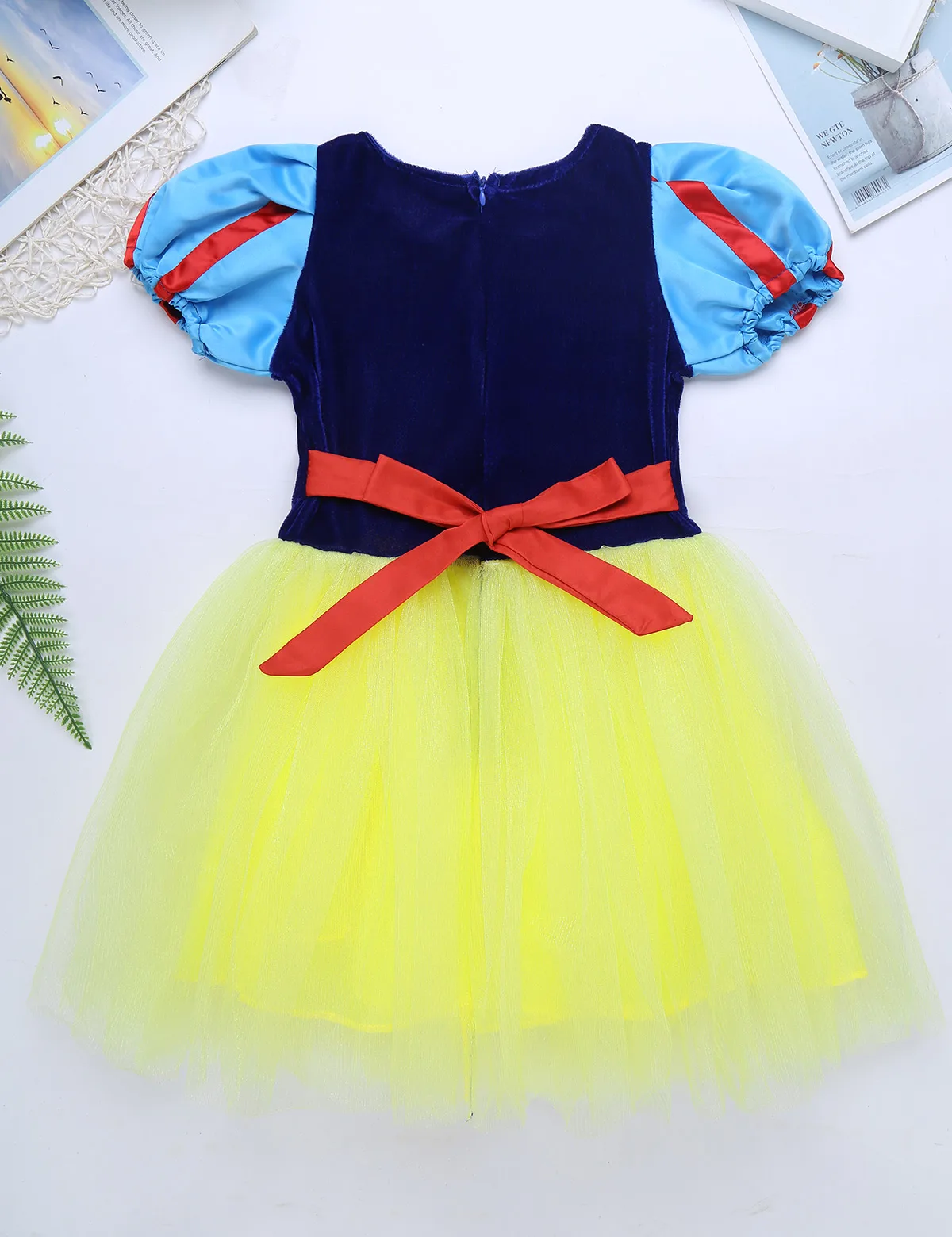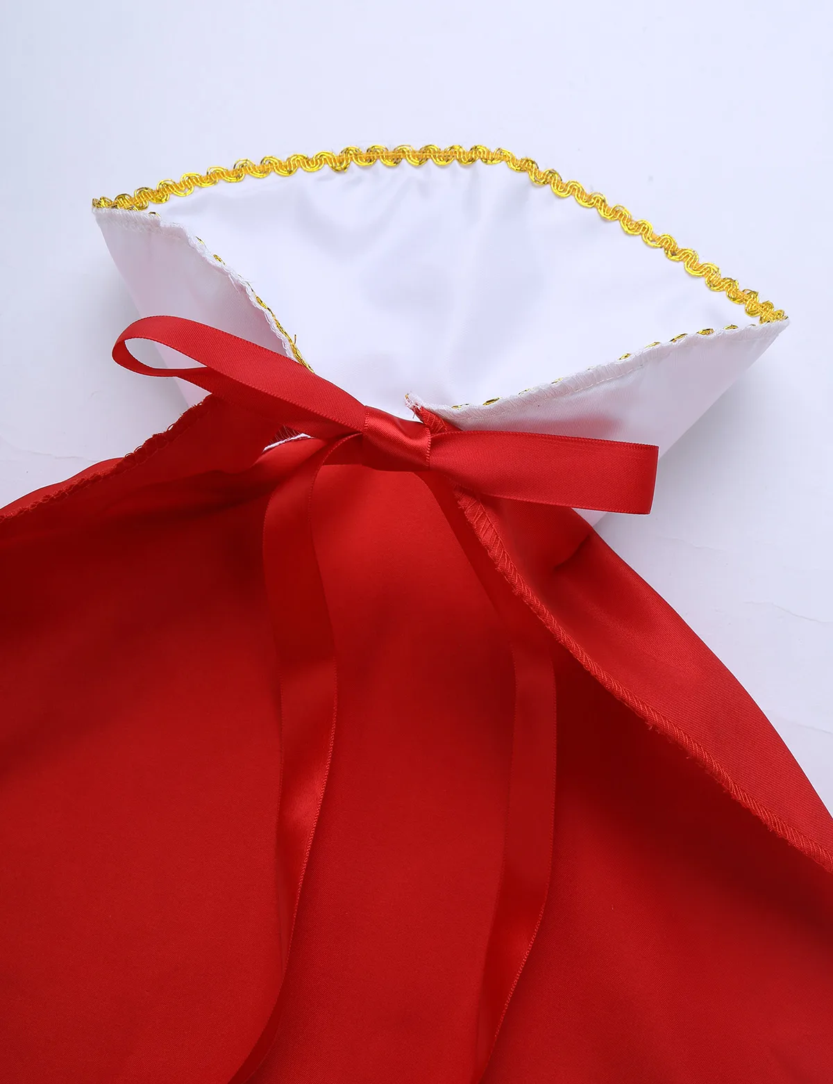 3 layers skirt, top 2 mesh layers, 1 lining. Matching a hair hoop, a red cape with ribbon ties. Your little princess will look like a real princess in this dress.