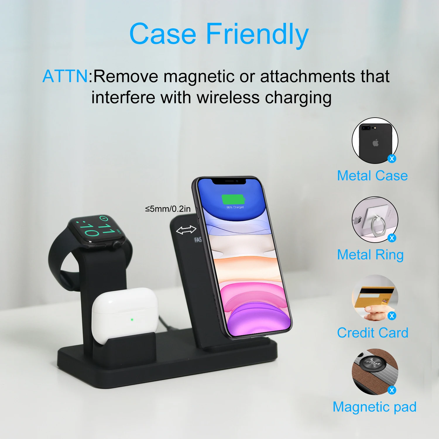 Цвет: черный/серый Вход: 5V 2A,9V 2A Мобильный телефон Беспроводной зарядки Мощность: 10 Вт, 7,5 Вт 5 Вт Для Apple Watch Выходная мощность: 2 Вт Для Airpods Выходная мощность: 3 Вт Стандарт: стандарт Qi