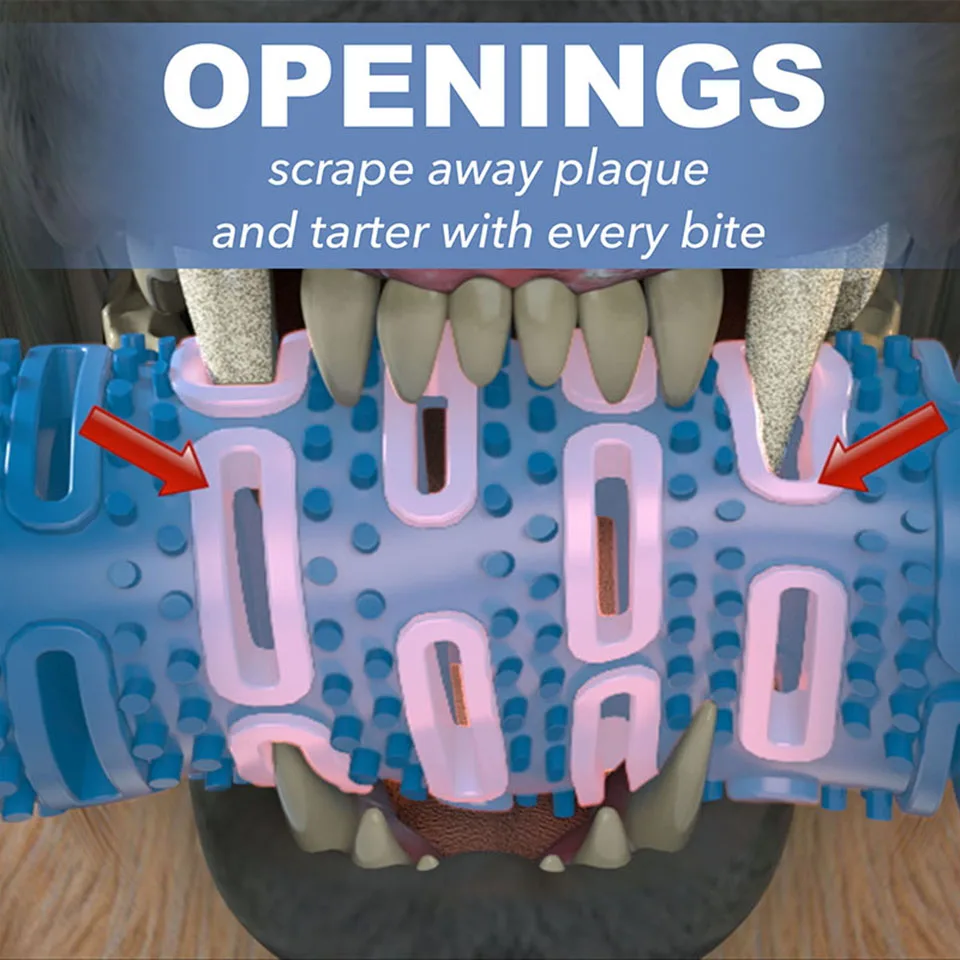 Работает 3 способа: зубная щетка для собак расчесывает зубы, скребки зубного камня и налет с зубов и массажные десны