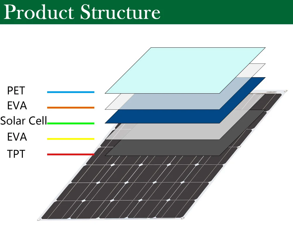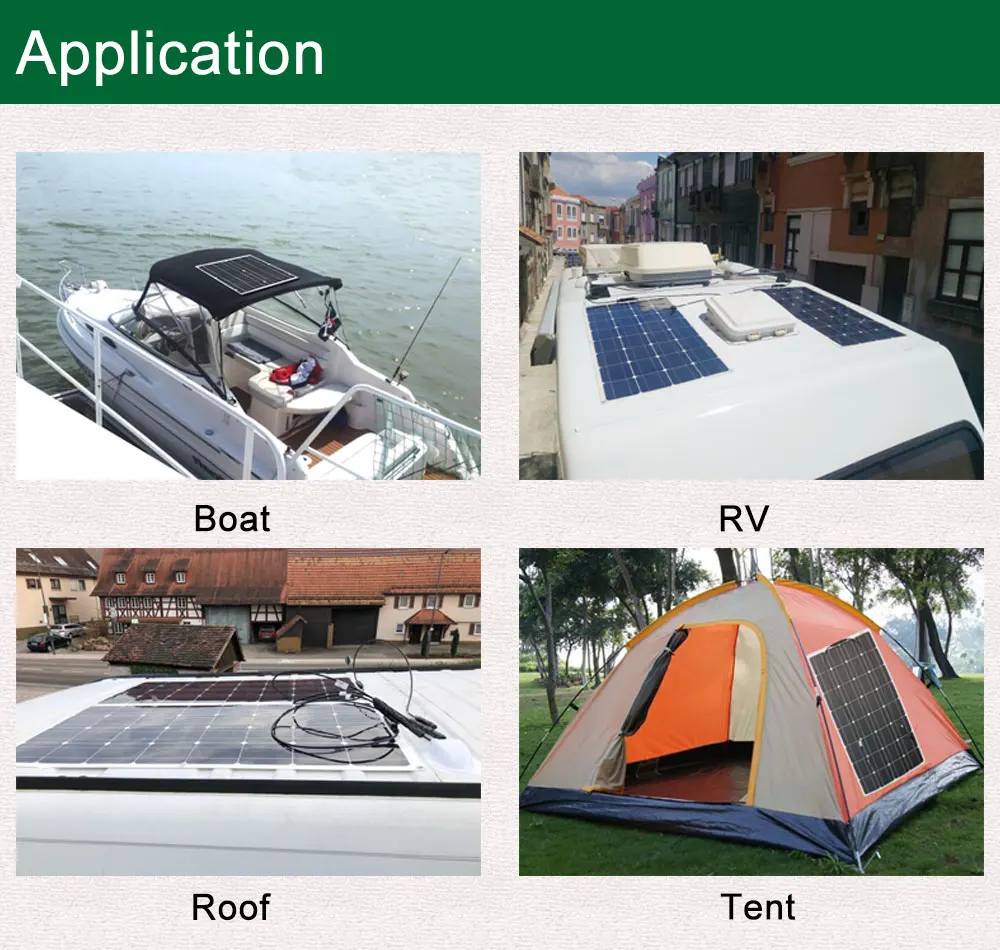 Различные с традиционными солнечными панелями, которые жестки и часто заключены в закаленное стекло, 100 Вт гибкие солнечные панели являются чем-то, кроме традиционного. Гибкая солнечная панель мощностью 100 Вт тонкая и может сгибаться до 30 градусов, которая может быть легко установлена на изогнутых поверхностях, высокая эффективность до 21% с небольшим размером для большой выходной мощности, легкий вес всего 1,7 кг только четверть его традиционной 100 Вт стеклянной солнечной панели. Эта панель также может быть использована для различных применений, включая обеспечение питания на лодке, фургоне, гольф-машине, трехколесном велосипеде, крыше палатки, даже если подвесили на окно, чтобы запитать свет и другие приложения постоянного тока. Солнечная панель 100 Вт может заряжать аккумулятор 12 В или 24 В или заряжать устройства 3,7 в, 6 в, 9 В с регулятором.