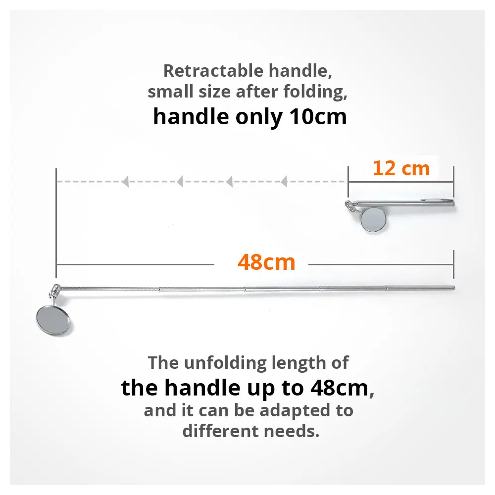 Made of alloy steel material for added durability. The telescoping mirror extends from 12cm to 50cm.
