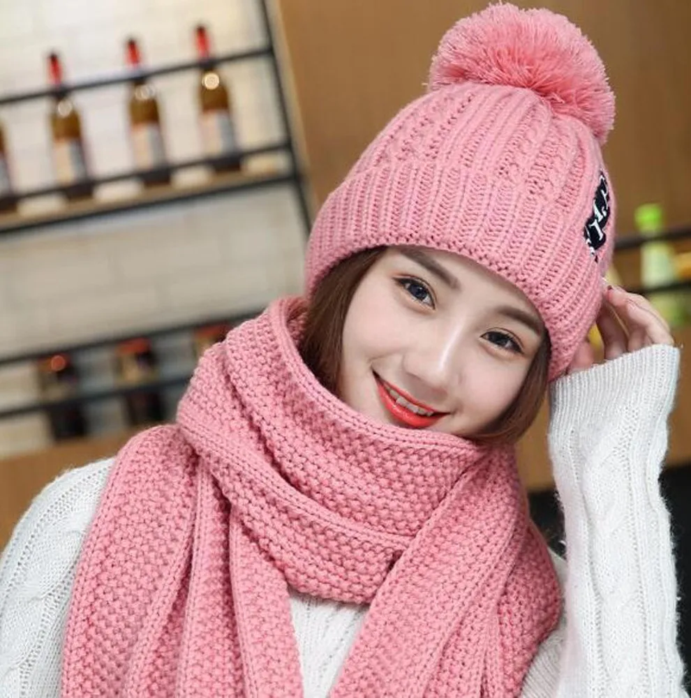 2 шт. шарф шапка набор женские зимние теплые однотонные помпоны вязаные мягкие шапки и шарфы