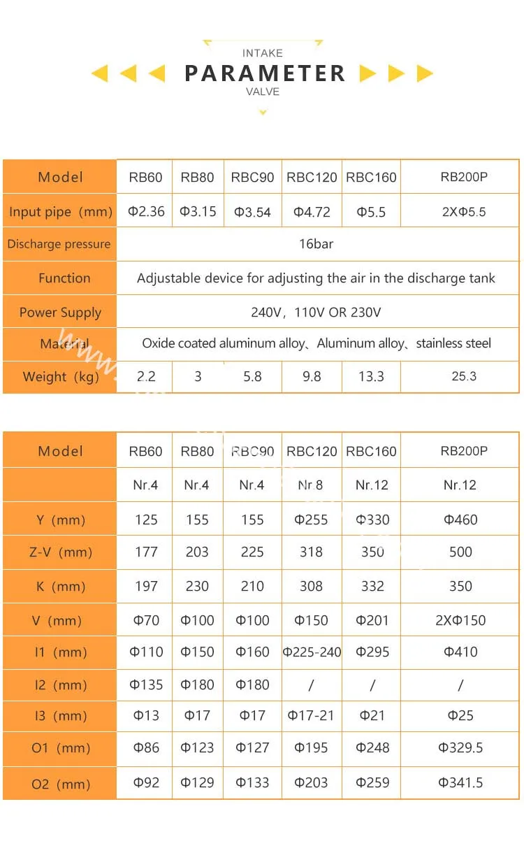 Доступен широкий спектр вариантов впускной клапан RB & RBC: E (система включения-выключения для стационарных машин), PM (полностью пневматическая рабочая система для портативных машин), P (гибридная рабочая система для стационарных и портативных машин), NR (только с обратным клапаном). Они доступны при различных напряжениях, при необходимости, а также с соединительными фланцами и сертификатами.