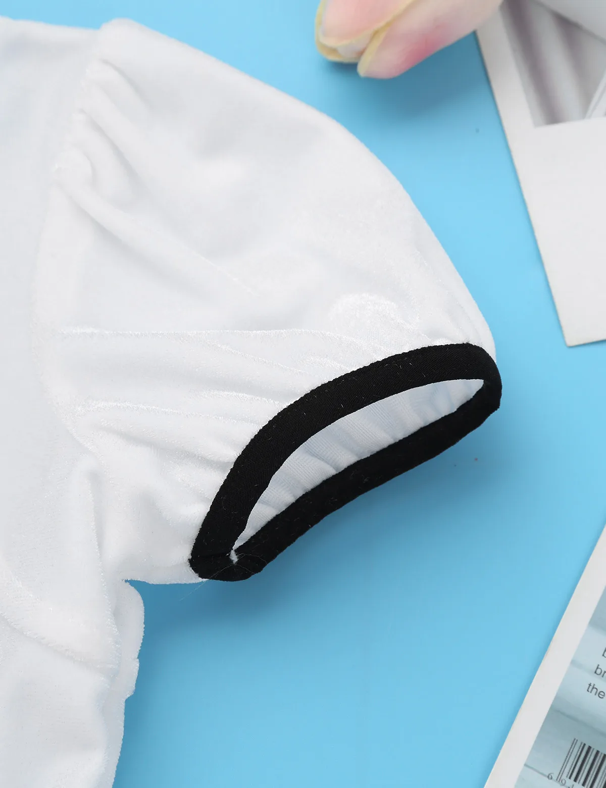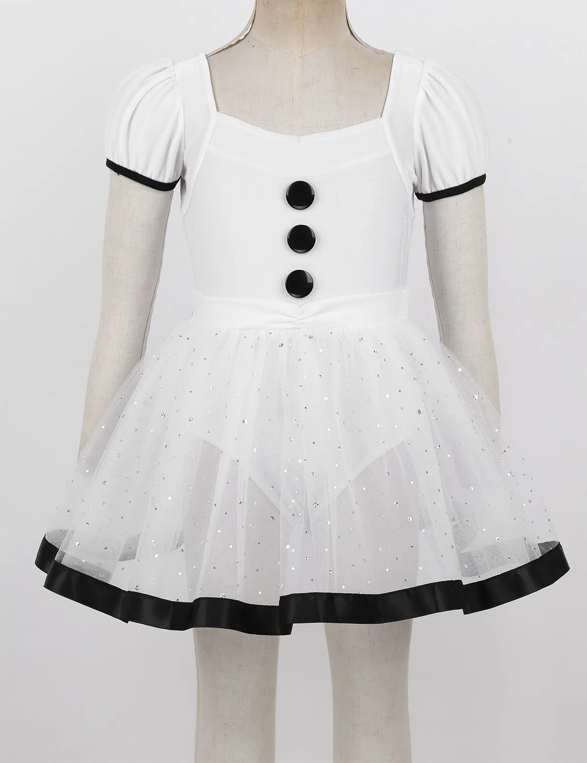 Короткие пышные рукава, квадратный вырез горловины, лиф из плиссированной ткани с тремя черными декоративными пуговицами спереди.