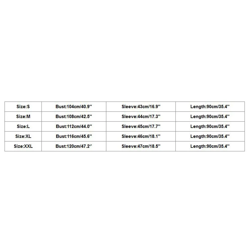 РазмерыОбхват грудиРукаваДлинаS104 см/40,9''43 см для ухода за ребенком для мам/16,9''90 см/35,4''М108 см/42,5''44 см/17,3''90 см/35,4''L112 см/44,0''45 см/17,7''90 см/35,4''XL116 см/45,6''46 см/18,1''90 см/35,4''XXL120 см/47,2''47 см/18,5''90 см/35,4''