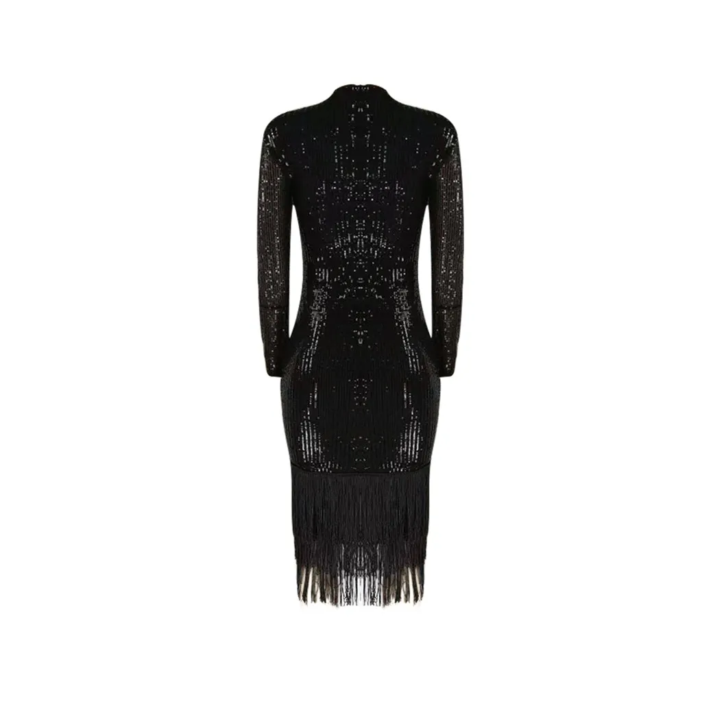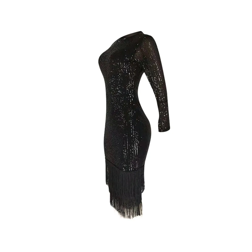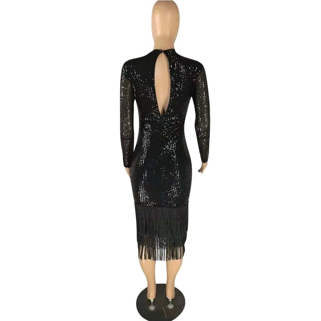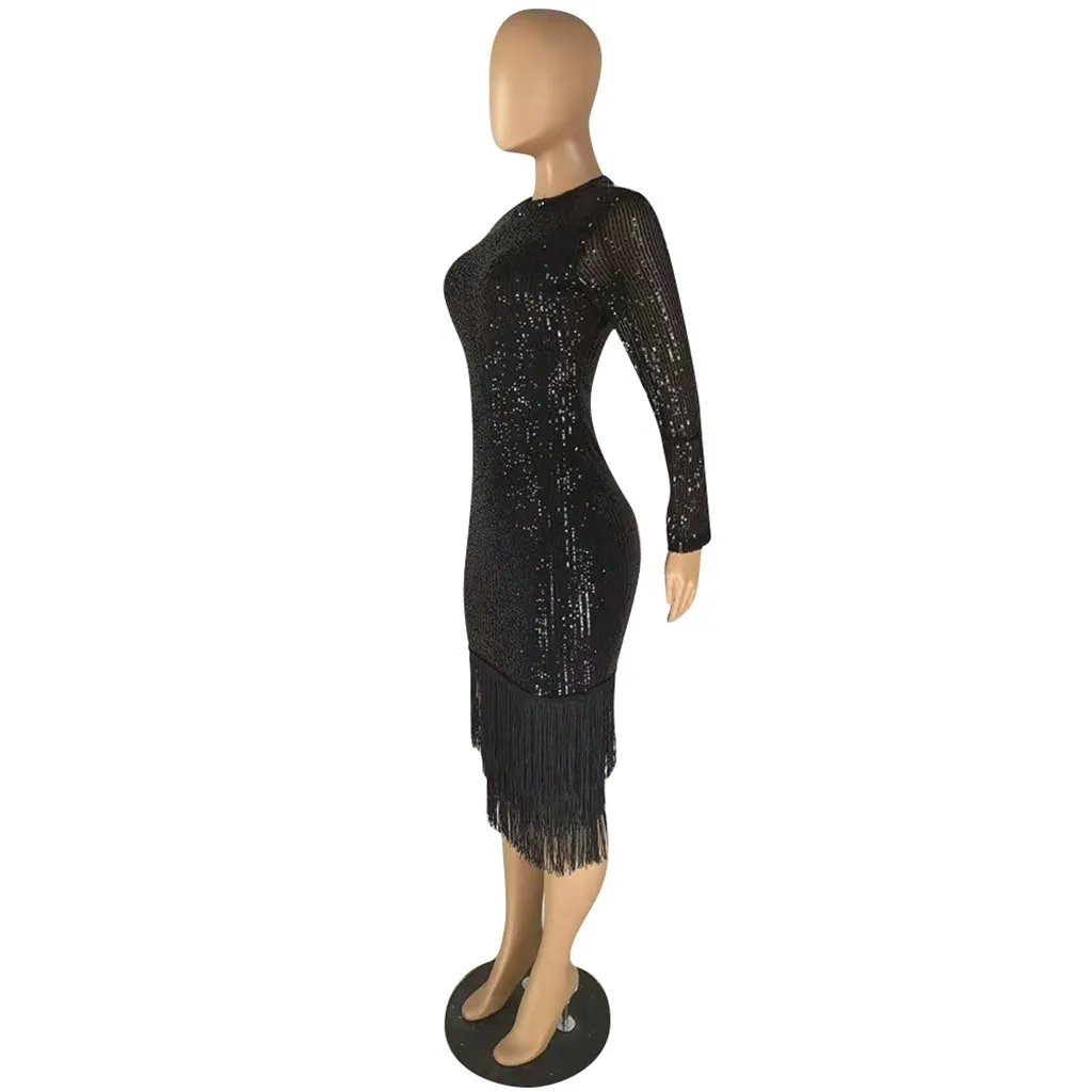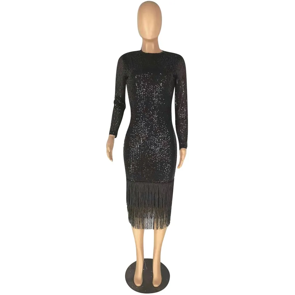 Модное женское сексуальное однотонное эластичное платье с длинным рукавом и блестками карандаш с кисточкой