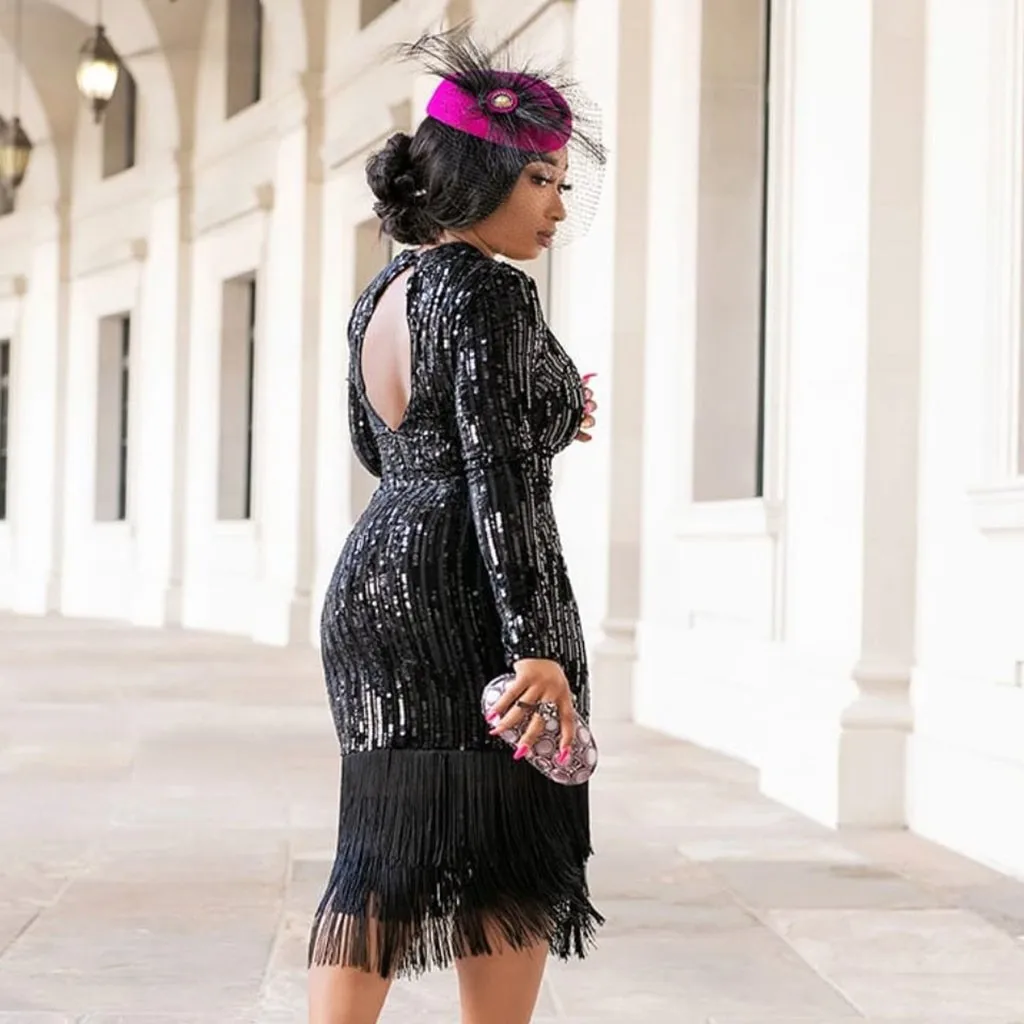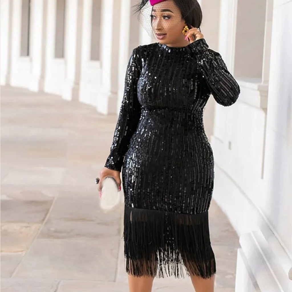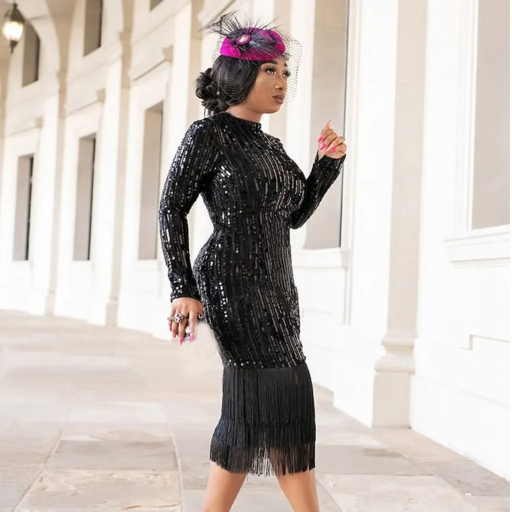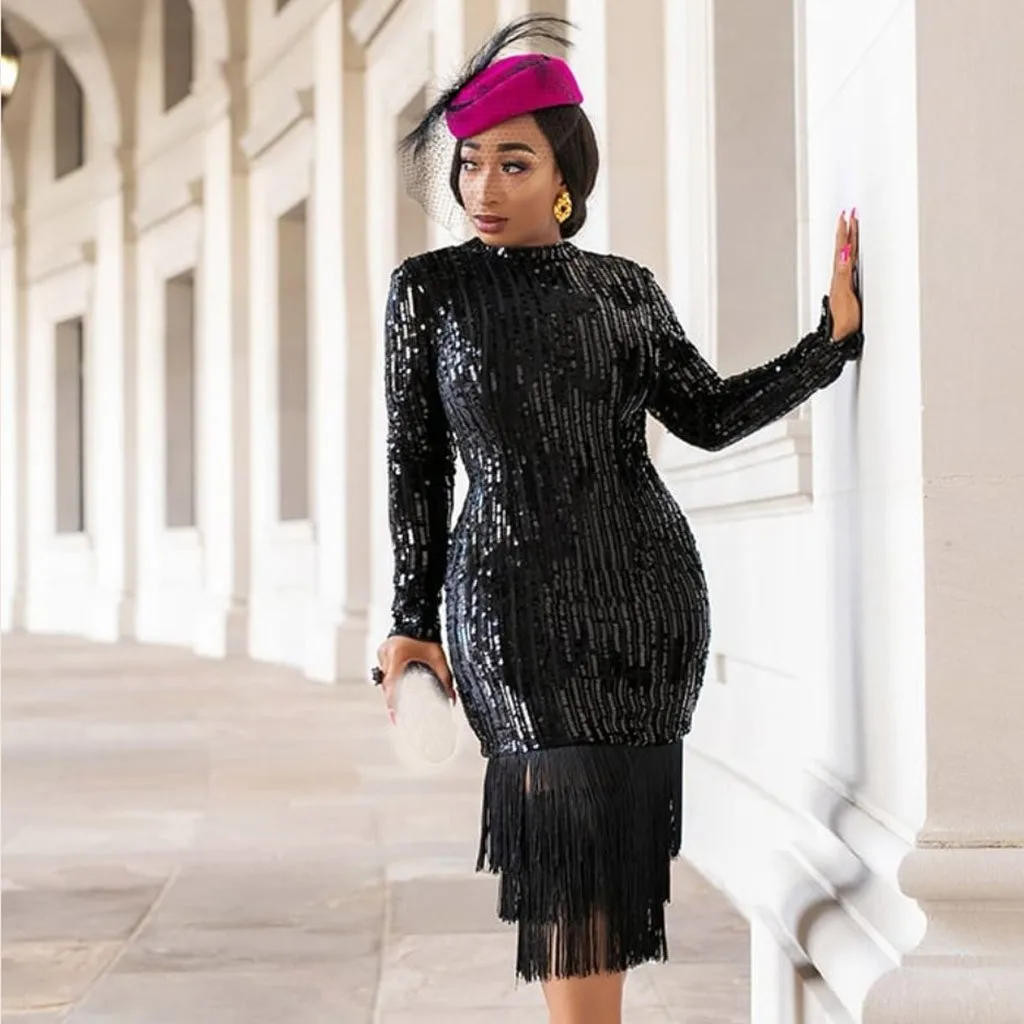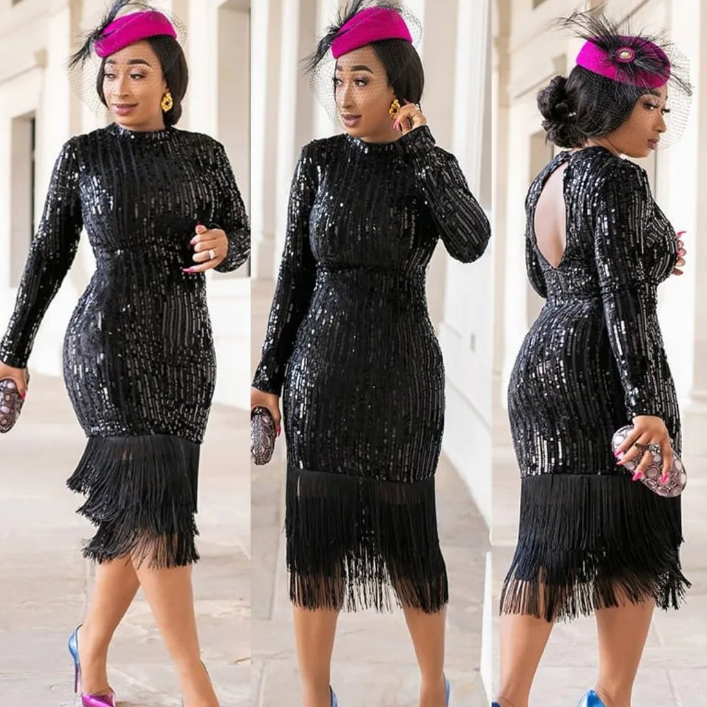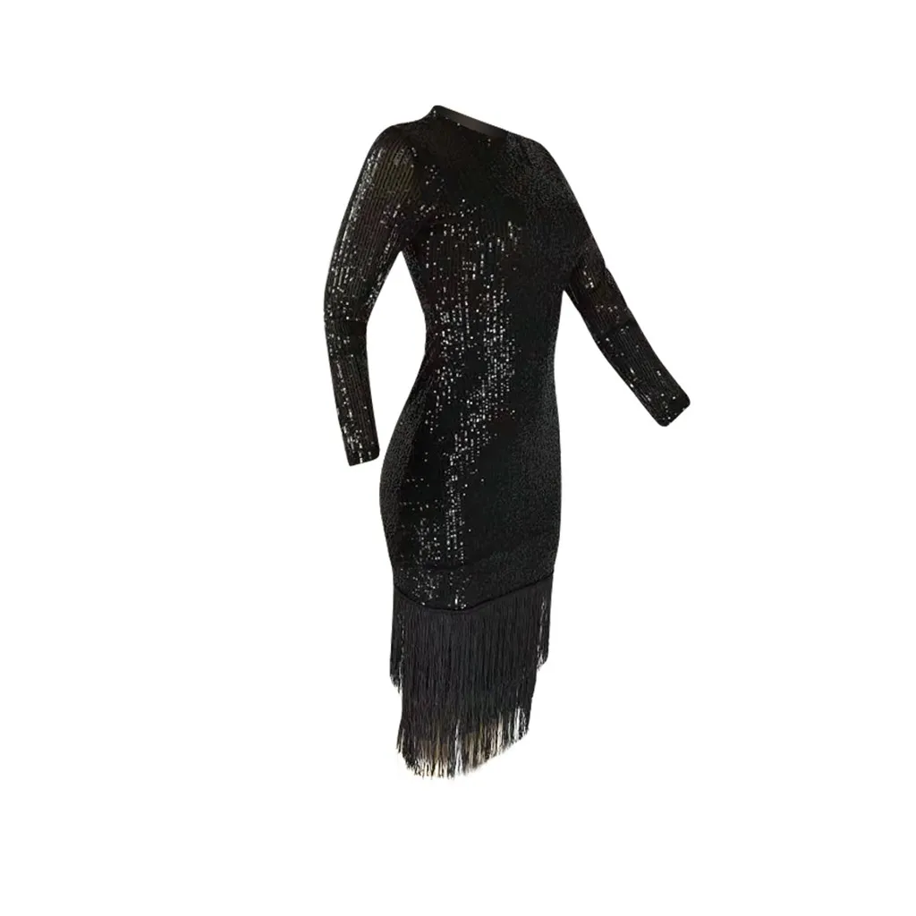 Модное женское сексуальное однотонное эластичное платье с длинным рукавом и блестками карандаш с кисточкой