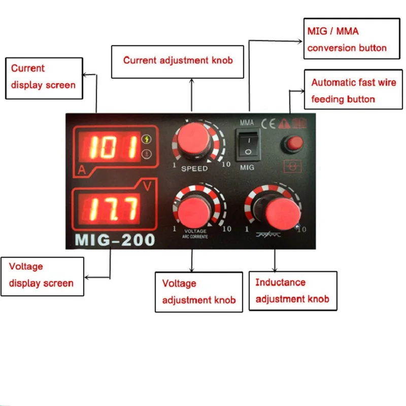 Модель: MIG-200 Вес: 13 кг Размер: 605X305X425 мм Уровень защиты: IP21S Класс изоляции F Номинальное напряжение: 230 В Частота 50/60 Гц Выходной ток 20 ~ 180A Выходной ток 60% Ток ММА 20-140A Особенности: 1.IGBT цифровая система управления 2. Этот сварочный аппарат представляет собой многопроизводственный сварочный аппарат, который используется для (1)MIG (металлическая Сварка инертным газом) Сварка инертным газом, в основном используется для сварки нержавеющей стали, алюминия, меди и других цветных материалов; (2)MAG (металлическая активная газовая сварка) двуокись углерода и другая активная газовая сварка в основном используется в сварочных железных материалах; (3) ручная сварка MMA и другая многоцелевая сварка и т. д. 3. Контроль формы волны, стабильная сварочная дуга; 4. Внутренний Фидер может работать с 5 кг проволочной катушки. Аксессуары: 15AK MIG фонарь с 3 м соединительным кабелем и разъемом Заземляющий зажим с 3 м соединительным кабелем и разъемом Газовая трубка Сварочная щетка Напоминание: Есть два цвета этого сварщика, серый и желтый для выбора, может быть некоторая разница в цвете между реальными продуктами и дисплеем на мониторе из-за разницы в освещении фотографирования светильник. Пожалуйста, обратитесь к товару, который вы получили, для фактического цвета.