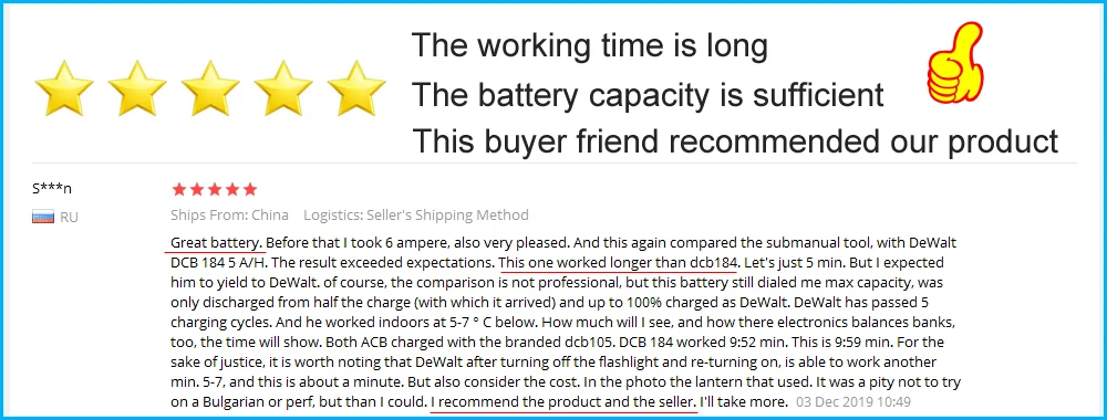 Емкость аккумулятора достаточная, длительное время работы (батарея работает дольше, чем собственный аккумулятор DCB184). Этот покупатель рекомендовал наш товар. Его оценка была достаточно объемной и детальной, что показывает, насколько он доволен аккумулятором, который купил в этот раз! Большое спасибо этому покупателю.