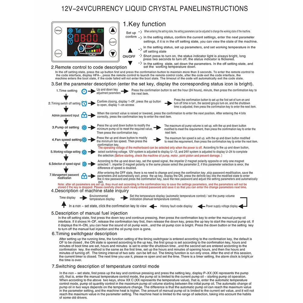 Особенности: 1. Он может обеспечить источник тепла для автомобиля, улучшить температуру внутри автомобиля и разогреть охлаждающую жидкость двигателя, чтобы избежать износа двигателя при низкой температуре. Способствует размораживанию салона автомобиля, запуску автомобиля, размораживанию стекла в автомобиле. 2. Низкий уровень шума, шумоподавление и минимальный уровень шума. Пульт дистанционного управления может дистанционно управлять Дизельный подогреватель воздуха для подогрева и регулировки. 3. Низкий расход топлива и низкий расход энергии, подходит для длительного использования. ЖК-дисплей может четко отображать состояние работы машины, может быть настроен для запуска и отключения, может регулировать объем масла, скорость ветра и температуру. Режим плато и ручной режим насоса (пожалуйста, будьте внимательны). 4. Компактный и простой в монтаже, компактный дизайн облегчает использование в различных небольших помещениях и может быть удален на новые транспортные средства после замены автомобиля. 5. Подходит для всех типов дизельных механических транспортных средств, например, автомобилей, грузовиков, автобусов, автодомов, грузовиков, кемперов, фургонов, строительных автомобилей, лодок и т. д., чтобы насладиться теплом в холодную зиму. Технические характеристики: Материал: металл, АБС-пластик Цвет: как на картинке Размеры: около 39*15*18 см/15,35*5,91 * 7.09in Напряжение: 12 В/24 В (опционально) Мощность: 5000 Вт Топливо: дизельное топливо Расход топлива (л/ч): 0,18-0,48 Рабочая температура нагревателя: -40 ℃-50 ℃ Рабочая температура масляного насоса: -40 ℃-40 ℃ Упаковочный лист: 1 * воздушный Нагреватель 1 * ЖК-дисплей 1 * Фильтр 1 * глушитель 1*10 л топливный бак 1 * пульт дистанционного управления 1 * ремень (комплект) 1 * впускная труба 1 * выхлопная труба 1 * Выход воздуховода 1 * трубка для масла 1 * масляный насос 1 * Насадка 1 * шнур питания 1 * фиксированная пластина 1 * Монтажный комплект Примечание: Пожалуйста, выберите напряжение 12 В для автомобильного аккумулятора и 24 В для 2 автомобилей-аккумуляторов (как правило, это грузовики и грузовики). Пожалуйста, подтвердите напряжение автомобильного аккумулятора и купите.