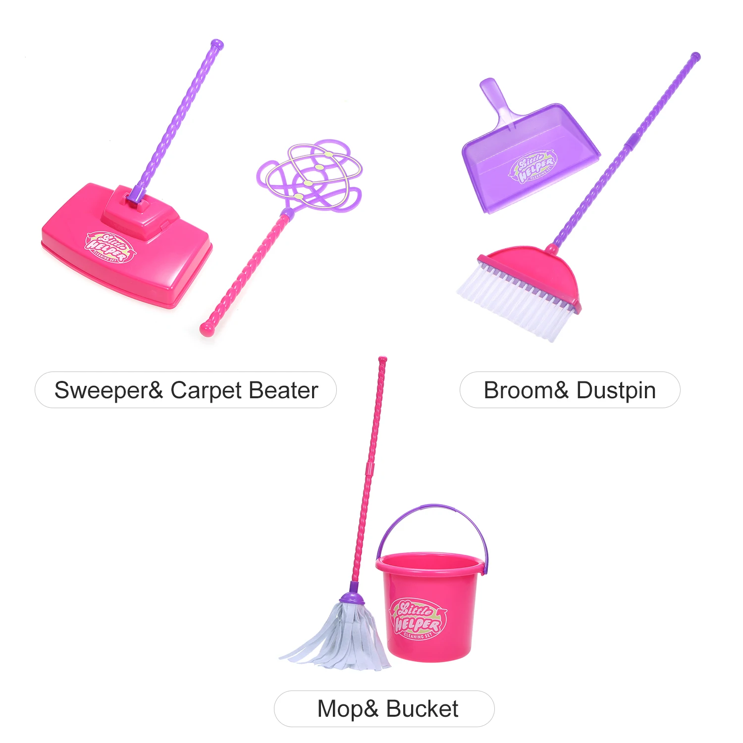 Набор игрушек для уборки включает в себя 3 типа, уборочную машину и ковёр, метлу и пыльник, швабру и ведро, с этим, стимулирует ваших маленьких быть занятыми и аккуратными.