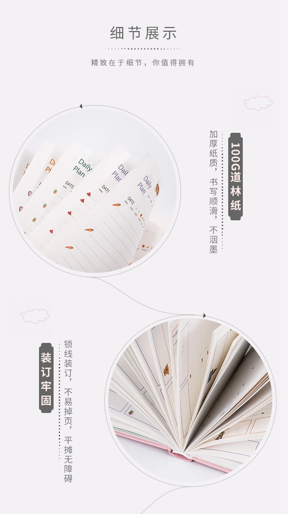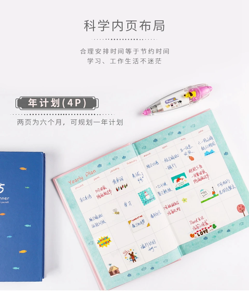 Внутренние страницы на 365 дней содержат 2 листа годового плана, 12 листов ежемесячного плана, ежедневные планы на 310 дней, 1 лист плана на 21 день и 14 листов примечаний.