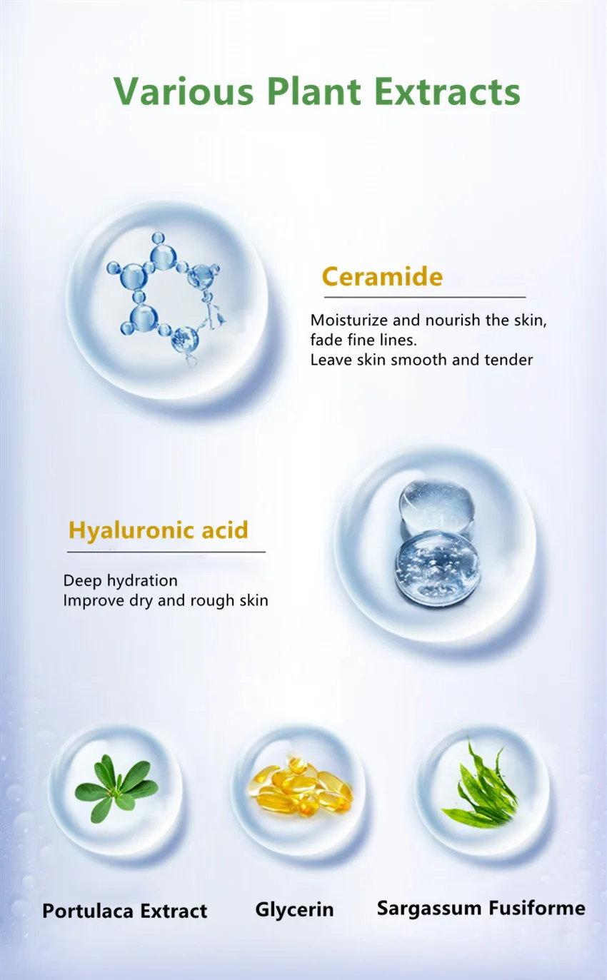 1. Керамид: увлажняет и питает кожу, выцветает тонкие линии, оставляет кожу гладкой и нежной 2. Гиалуроновая кислота: глубокое увлажнение, улучшение сухой и грубой кожи 3, экстракт портулака 4, глицерин 5, саргасс fusiforme