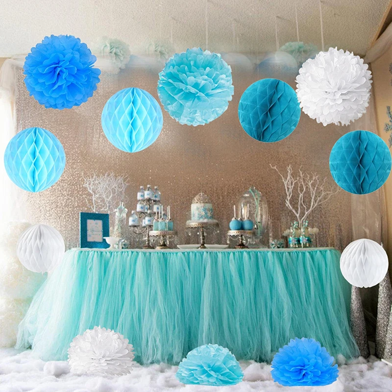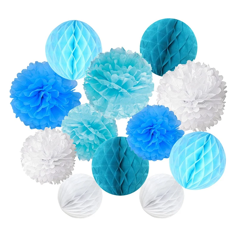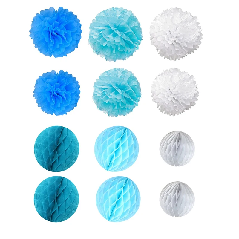 C: (6 pieces of peony paper flowers: 3 colors, blue, sky blue and white, 2 sizes 10 inches and 12 inches, can decorate your party well. 6 pieces of paper honeycomb balls: 3 colors, Sky blue, sky blue and white, 2 sizes, 20 cm and 25 cm.