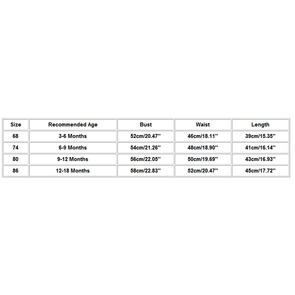 Размеры Рекомендуемый возраст Бюст Талия Длина 68 3-6 месяцев 52 см/20,47'' 46 см/18,11'' 39 см/15,35'' 74 6-9 месяцев 54 см/21,26'' 48 см/18,90'' 41 см/16,14'' 80 9-12 месяцев 56 см/22,05'' 50 см/19,69'' 43 см/16,93'' 86 12-18 месяцев 58 см/22,83'' 52 см/20,47'' 45 см/17,72''