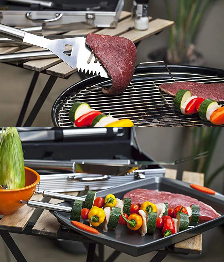 including slotted spatula, barbecue fork, all-purpose knife, tong, basting brush, grill brush, skewers, corn holders, you are not limited to grilling steaks and other meats.