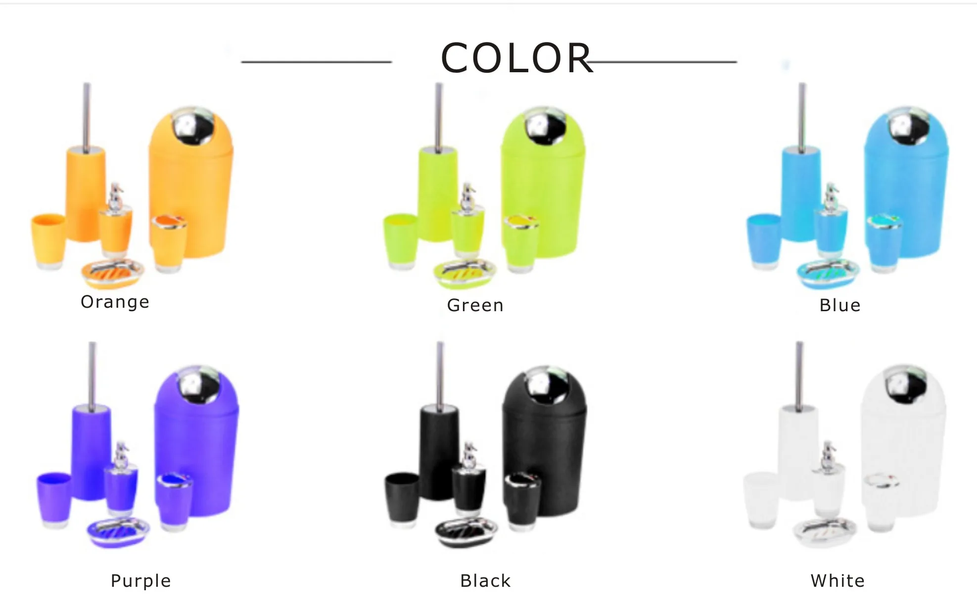 -Бутылка для хранения жидкости Размер: 7,5 х7, 5 х17 см Материал: полипропилен Характеристика: в нем имеется плакированная аэрозольная мышь для нажатия, что позволяет легко получить жидкость и сделать ее более прочной. -Чашка и кружка Размер: 7,5 х7, 5 х11 см Материал: полипропилен Характеристика: современный дизайн, передовая техника и ремесло. Держатель зубной щетки Размер: 7,5 х7, 5 х11, 5 см Материал: полипропилен Характеристика: содержит две зубные щетки и одну пасту, чтобы легко вынуть. -Коробка для мыла Размер: 13x9, 5x2,5 см Материал: полипропилен Характеристика: всегда сохраняйте сухость мыла -Щетка для унитаза Размер: 10x10x21 см, 10x10x56 см Материал: ПП + нержавеющая сталь Характеристика: дизайн человека, хорошо очищается. -5 л мусорного ведра Размер: 19x19x32 см Характеристики: экономия места маленького размера, откидная крышка для более удобного использования