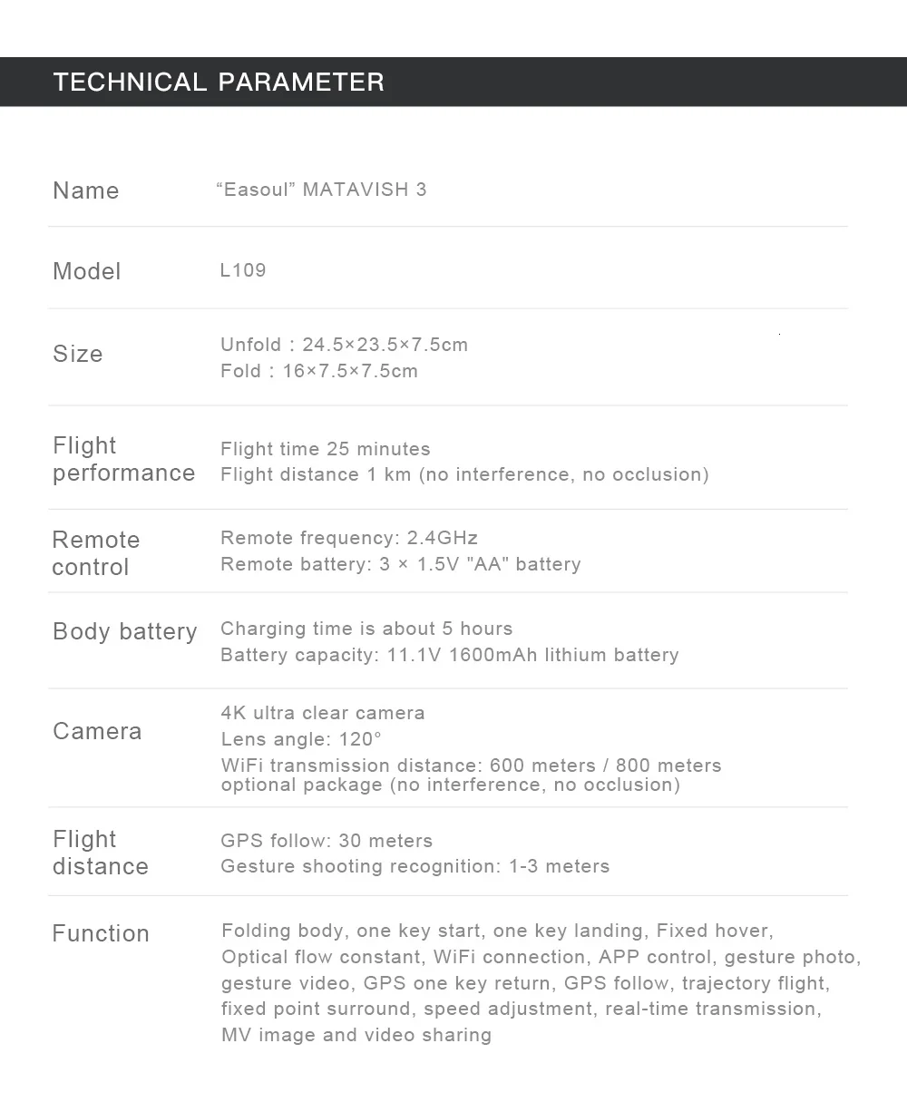 Description:Item NO: L109Color: SilverApplicable Age: 14 Years Old Or OlderAppearance Material: ABSChannel: 4 ChannelsGyro: 6 AxisMotor: 1406 Brushless MotorZoom: 50 TimesElectric Adjustment Camera Angle: 90°Camera Wide Angle: 120°Electronic Image Stabilizer: SupportConfiguration Frequency: 2.4GHzRemote Control Distance: 1000 Meters (No Interference, No Occlusion)Charging Time: 4 Hours Or SoFlight Time: 25 Minutes Or SoTransmission Method: FPVFigure Transmission Distance: 600 Meters (No Interference, No Occlusion)Photo Resolution: 3840*2160PVideo Resolution: 1920*1080PPhoto Recording Mode: Remote Control + APP ControlRemote Control Battery: 3 AA Batteries (Not Included)Quadcopter Rechargeable Battery: 11.1V 1600mAh Lithium Battery (Included)Хорошие и удобные легинсы, я их дома уже несколько месяцев ношу. Они действительно хорошего качества - не растягиваются и не... Читать отзыв полностью...