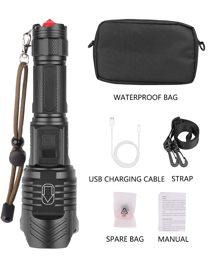 Посылка C: 1 * светодиодный фонарик + 1 * Набор аксессуаров (включая1 * водонепроницаемая сумка + 1 * ремень + 1 * запасная сумка + 1 * Руководство) + 1 * Зарядное устройство USB +1 * аккумулятор 26650 + 1 * Зарядное устройство USB