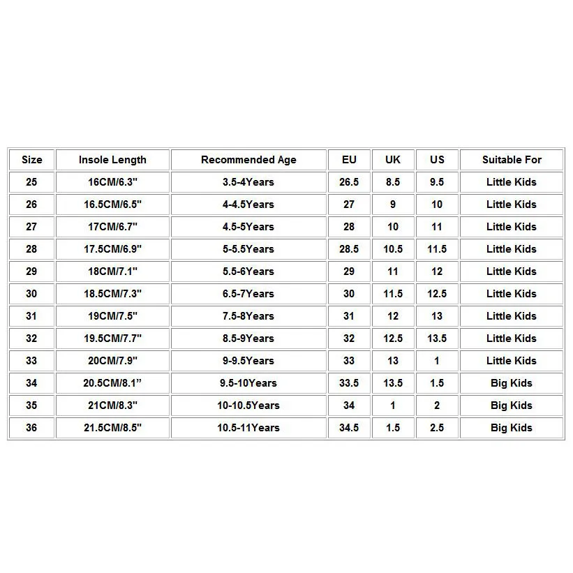 Размер Стельки Длина Рекомендуемый возраст ЕС Великобритания Свяжитесь с нами Подходит для 25 16 см/6,3" 3,5-4 лет 26,5 8,5 9,5 Дети дошкольного возраста 26 16,5 см/6,5" 4-4.5Years 27 9 10 Дети дошкольного возраста 27 17 см/6,7" 4,5-5 лет 28 10 11 Дети дошкольного возраста 28 17,5 см/6,9" 5-5.5Years 28,5 10,5 11,5 Дети дошкольного возраста 29 18 см/7,1" 5,5-6 лет 29 11 12 Дети дошкольного возраста 30 18,5 см/7,3" 6,5-7 лет 30 11,5 12,5 Дети дошкольного возраста 31 19 см/7,5" 7,5-8 лет 31 12 13 Дети дошкольного возраста 32 19,5 см/7,7" 8,5-9 лет 32 12,5 13,5 Дети дошкольного возраста 33 20 см/7,9" 9-9.5Years 33 13 1 Дети дошкольного возраста 34 20,5 см/8,1" 9,5-10 лет 33,5 13,5 1,5 Дети младшего школьного возраста 35 21 см/8,3" 10-10.5Years 34 1 2 Дети младшего школьного возраста 36 21,5 см/8,5" 10,5-11 лет 34,5 1,5 2,5 Дети младшего школьного возраста