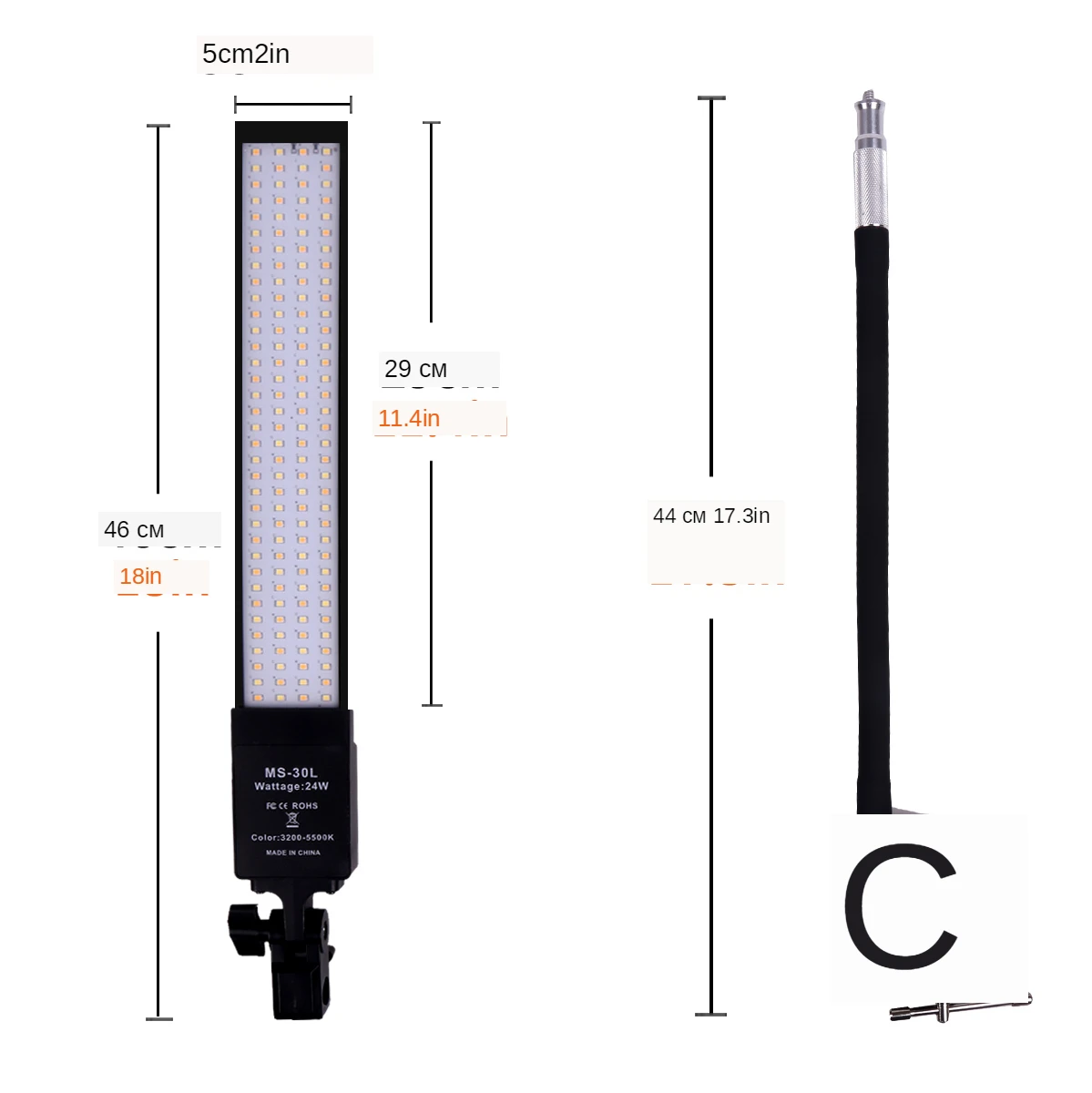Свет длиной 18 дюймов, электрическая розетка может поворачиваться на 180 градусов, а Настольный мягкий трубчатый зажим-на 17,3. Его можно свободно согнуть, чтобы удовлетворить любой угол съемки. Он может быть закреплен на рабочем столе, не занимает место, легкий и не громоздкий.