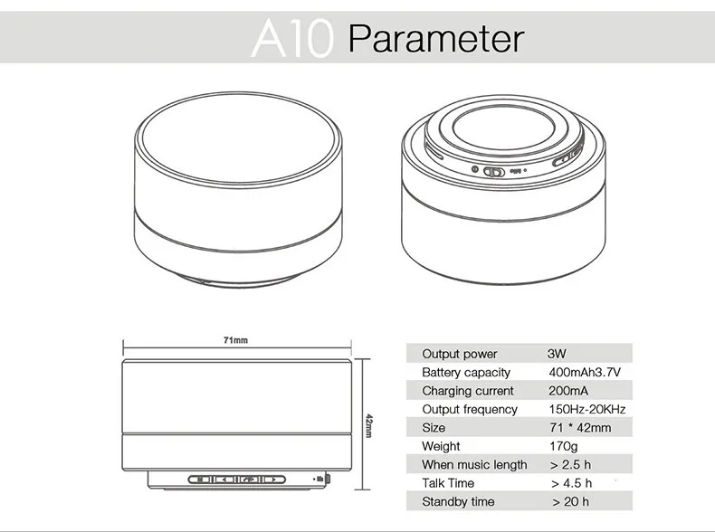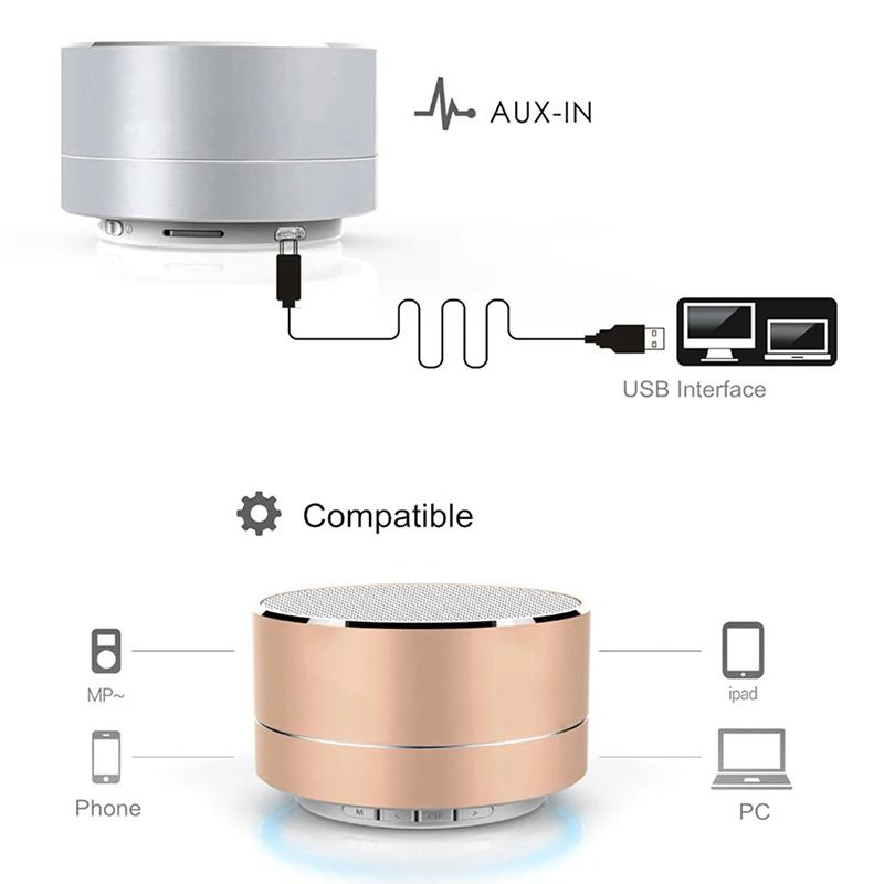 Constructed with metal casing, high quality and durable Assorted colors for you to choose Stereo and bass sound effect Specifications: 1.Material: Metal + ABS 2.Interface type: USB 3.Loudspeaker accommodation mode: Button 4.Power: 3W 5.Distance: 10meters 6.Charging current: 200mA 7.Battery: 400mAh8.Dimension: 71* 44mm