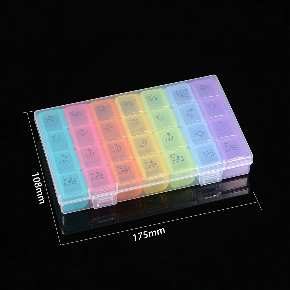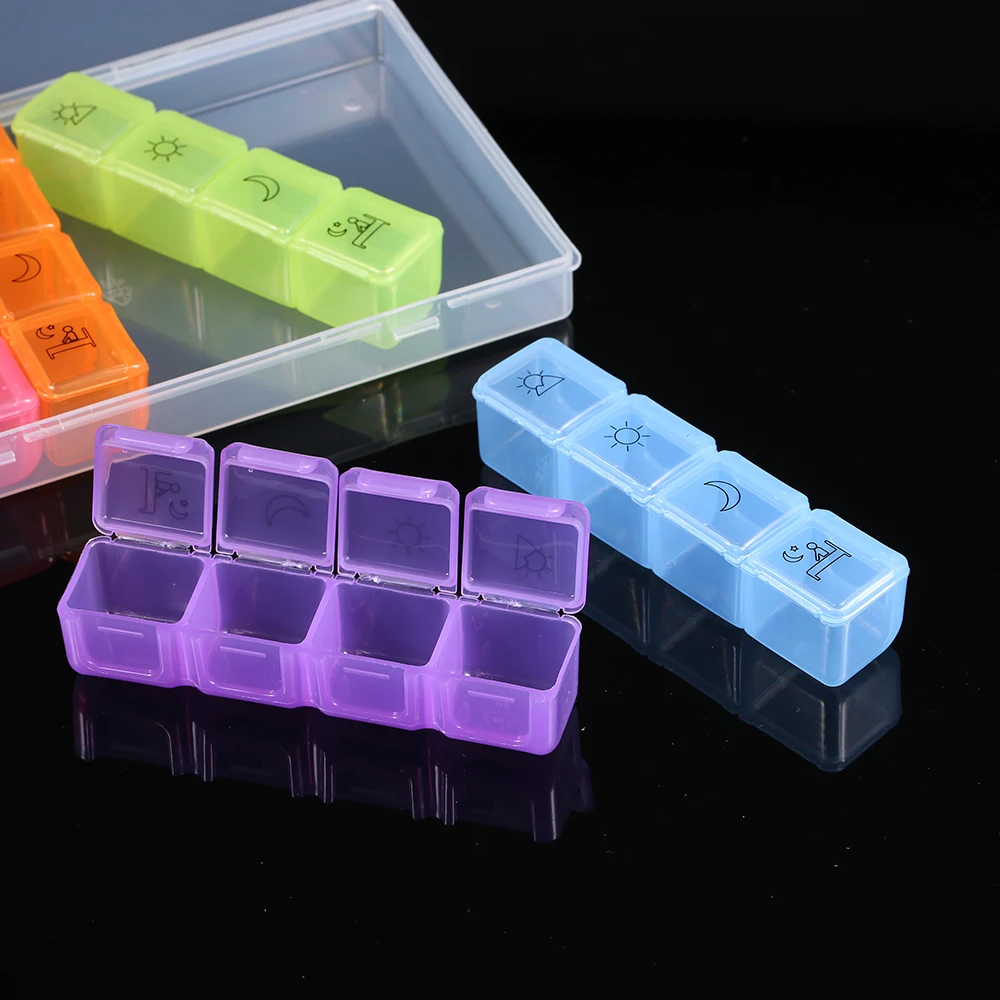 Этот 7-дневный органайзер для таблеток с 28 таблетки отсеками предназначен для тех, кто принять лекарство до 4 раз в день. С этим дозатором таблеток вы никогда не забудете принимать таблетки.
