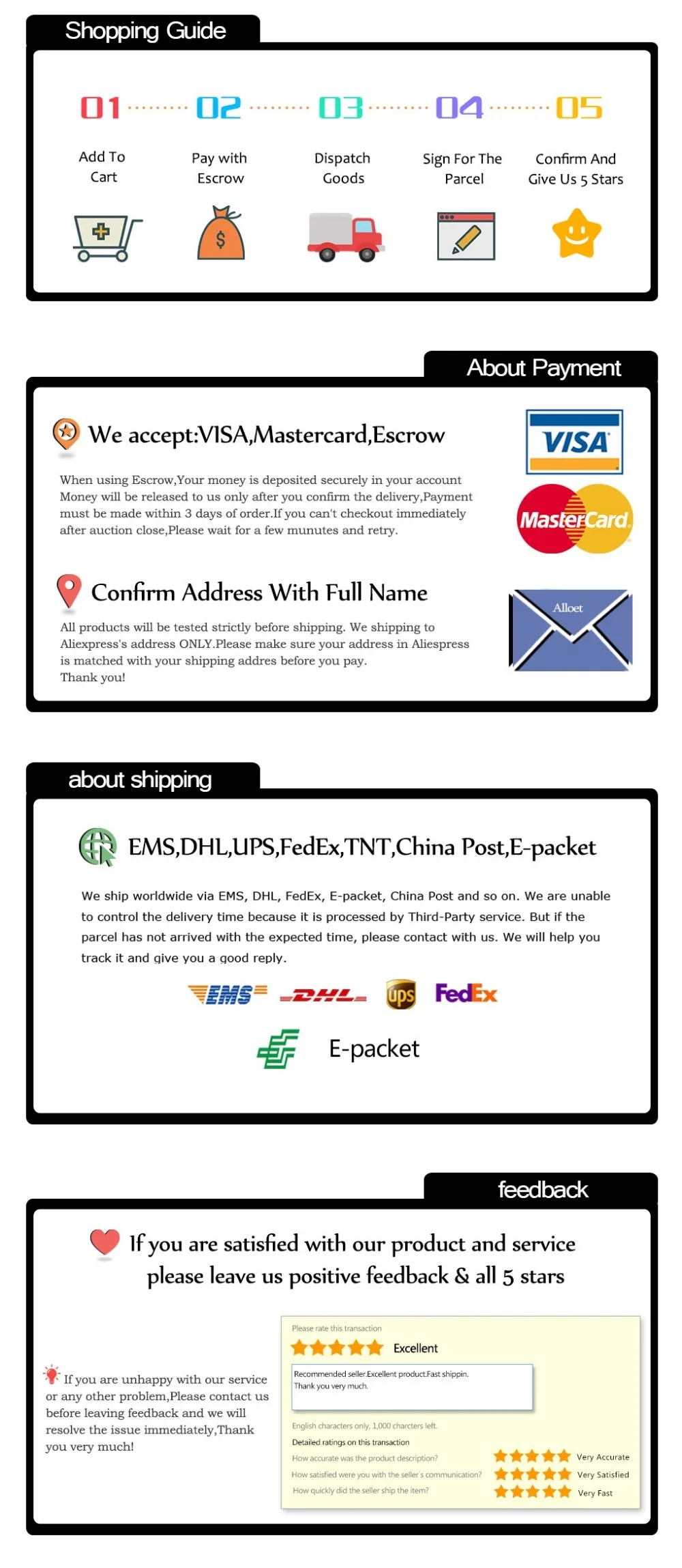 1. Что касается таможенной пошлины или налога на импорт, то в цену не входит налог, покупатели несут ответственность за таможенную пошлину или налог на импорт в вашей стране. 2. Обслуживание и обратная связь KAIPUTE сосредоточены на высококачественных продуктах, также обладают хорошим качеством обслуживания для каждого клиента. Если у вас есть какие-либо предложения/проблемы после получения посылки, пожалуйста, свяжитесь с нами, прежде чем дать нам нейтральный или отрицательный отзыв, мы постараемся сделать все возможное, чтобы дать вам удовлетворительное решение. Если вы удовлетворены продуктами, пожалуйста, дайте нам 5 звезд в отзыве. Наш прогресс, потому что все вы!