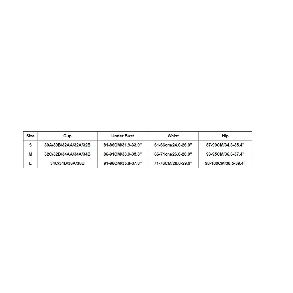 Размер Чашка Под грудью Талия Бедра S 30A/30B/32AA/32A/32B 81-86 см/31,9-33,9" 61-66 см/24,0-26,0" 87-90 см/34,3-35,4" М 32C/32D/34AA/34A/34B 86-91 см/33,9-35,8" 66-71 см/26,0-28,0" 93-95 см/36,6-37,4" L 34C/34D/36A/36B 91-96 см/35,8-37,8" 71-76 см/28,0-29,9" 98-100 см/38,5-39,4"