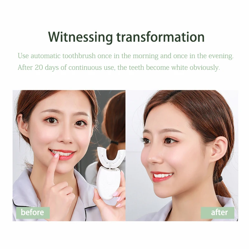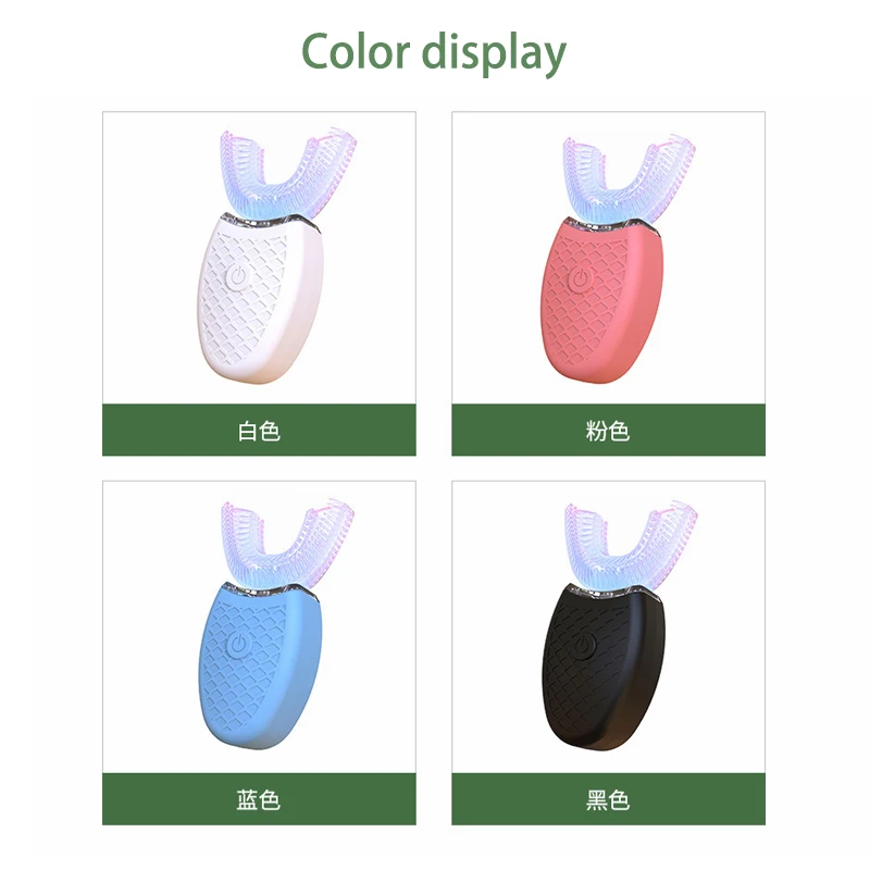 Intruction: Материал: силикон + АБС Форма: u-тип Угол обзора: 360 градусов Зарядка: usb-интерфейс для зарядки Время очистки: 45 секунд Время зарядки: 90 минут Режимы: 3 режима (режим очистки/режим массажной резинки/Режим отбеливания) Частота: 5000-15000 раз/мин Водонепроницаемый: IPX7 Инструкции по использованию: 1. После полной зарядки Установите u-образную головку кисти. 2. Встряхните жидкую зубную пасту из пены и равномерно нанесите ее на u-образную головку кисти. 3. Положите головку кисти в рот, расслабьте u-образную головку кисти и выберите правильный режим частоты. 4. Легко прикасайтесь к зубам и встряхните щетку назад и вперед руками одновременно, а затем почистите зуб более чистым. 5. После чистки зубов используйте влажную ткань для очистки воды и застоя фюзеляжа и старайтесь избегать замачивания в воде. 6. Пожалуйста, внимательно прочитайте инструкцию.