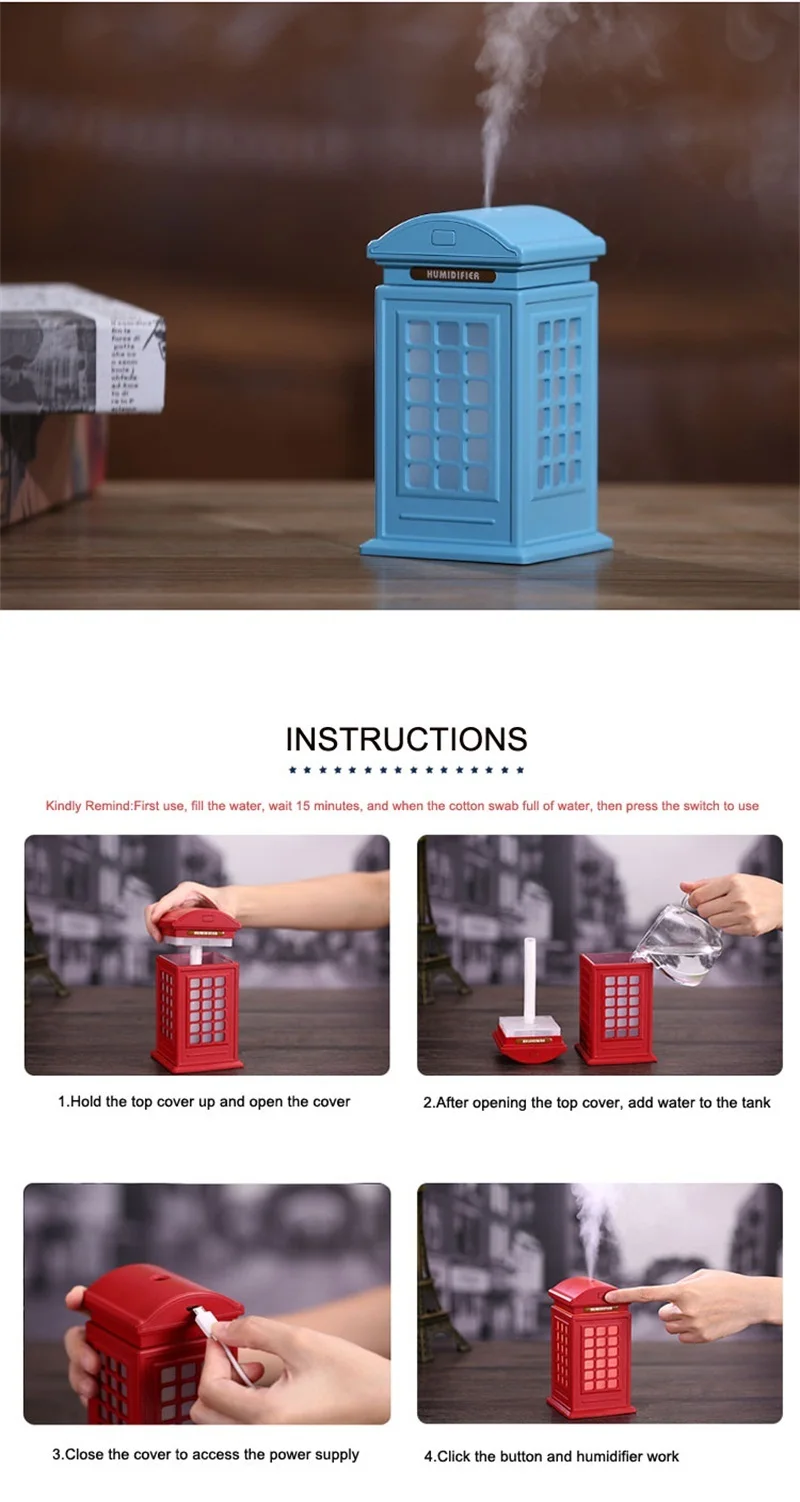 Продукт: увлажнитель для телефонной будки Материал: АБС + ПП Резервуар для воды: 300 мл Размер: 80*80*142 (мм) Цвет: синий, белый, красный Мощность: 1,5 W Напряжение: DC5V