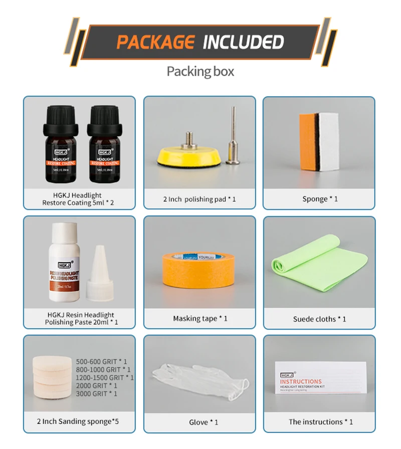 5. Равномерно распределите покрытие фар HGKJ на лампе губкой или замшевой тканью. Оставьте его сухим и не прикасайтесь к нему в течение 2 часов. Не прикасайтесь к дождю в течение 3 дней (применяется только один раз, не повторяйте)