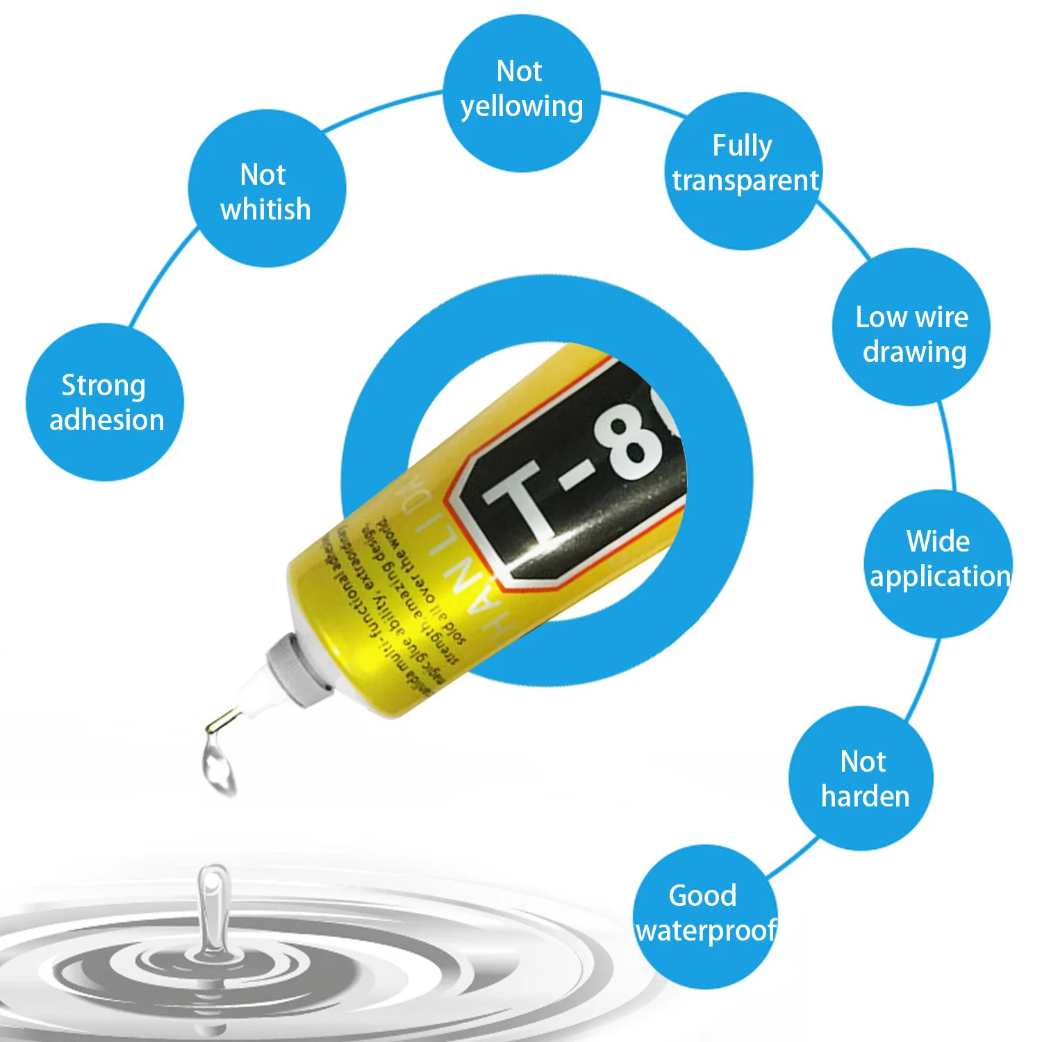 В комплект входят 2 шт. клея t8000, которые имеют сильный клей, эффективно соединяющийся с расширением материала с поверхностью.