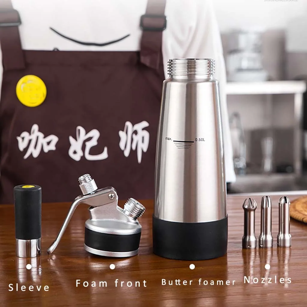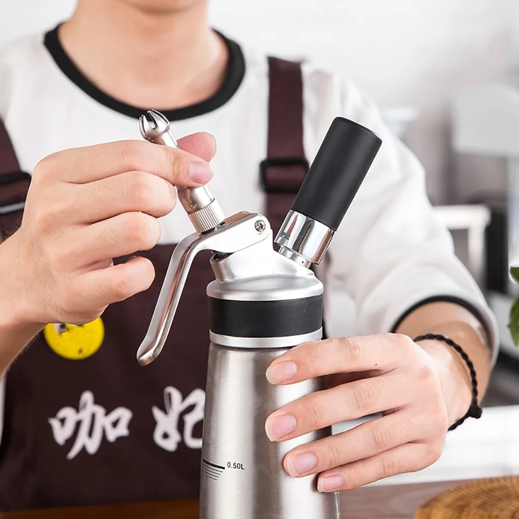 Это дозатор для взбитых сливок, его основной корпус изготовлен из алюминиевого материала, прочный, прочный и легко чистится. Простота в эксплуатации, этот профессиональный инструмент поможет вам получить нежный крем, подходящий для кексов, тортов и десертных кремов.