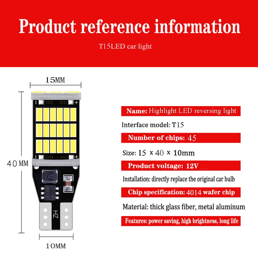 Описание: 1. Рабочее напряжение: DC12V для автомобилей 2. Угол освещения: 360 градусов 3. Доступные цвета: белый, красный, янтарный 4. Светодиодный Тип: 45 шт 4014SMD 5. Ошибка Canbus (без ошибок OBC) 6. Идеальная замена для старой галогенной лампы. Розетках: T15 901 904 906 912 916 917 918 920 921 922 927 928 939 W16W Функция: 1. Только используется для заднего хода автомобиля. 2.Canbus без ошибок: встроенные резисторы нагрузки canbus, чтобы избежать ошибки OBC. Пожалуйста, подтвердите свою розетку перед покупкой, место установки только для справки. Посылка: 4 шт. T15 светодиодные фонари