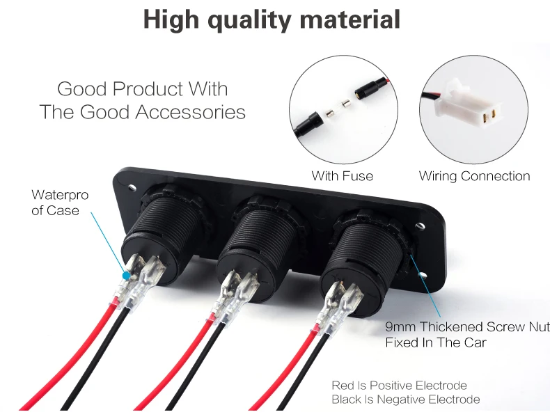 Описание: 1. Панель с тремя отверстиями: штекер прикуривателя + дисплей напряжения + двойной USB + переключатель. Небольшой размер и отличная производительность. Простота установки, удобство в использовании. Универсальный подходит для автомобиля 12 В, мотоцикла, ATV, лодки, автомобиля или корабля. 2. Четыре usb-выхода позволяют заряжать 4 usb-устройства одновременно, чтобы сэкономить ваше время. USB зарядное устройство широко используется для электрооборудования питания, таких как транспортное средство, GPS, мобильный телефон, камера, mp3. 3. Интеллектуальная конструкция цепи защищает от избыточного тока, перегрева и перезарядки. Обеспечить безопасность зарядки. 4. Тумблер: легко управлять и с красным светом, чтобы напоминать людям, когда включается. Многофункциональный продукт, идеально подходит для использования в путешествиях. 5. С многофункциональной функцией защиты: Встроенный идентификационный резистор, защита от обратной полярности, защита от перегрузки по току, защита от перегрева, защита от короткого замыкания. Умный дизайн для защиты вашего устройства от повреждений. Технические характеристики: Материал: АБС-пластик Кулисный Переключатель: Контур петли: ВКЛ-ВЫКЛ Входное напряжение: 12 В/24 В Класс защиты от поражения электрическим током: IP66 Двойной USB порт: Рабочее напряжение: 12-24 В Ток на выходе: 4.2A Выходное напряжение: 5 В Светодиодный свет: синий Гнездо для автомобильного прикуривателя: Рабочее напряжение: 12-24 В Выходное напряжение: 12-24 В Отображение напряжения: Диапазон отображения вольтметра: 6-24 В Вольтметр Цвет: синий/красный/зеленый Посылка включает в себя: 1 х Автомобильное зарядное устройство USB разъем