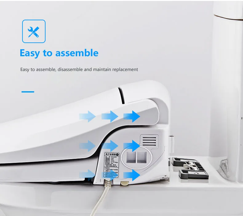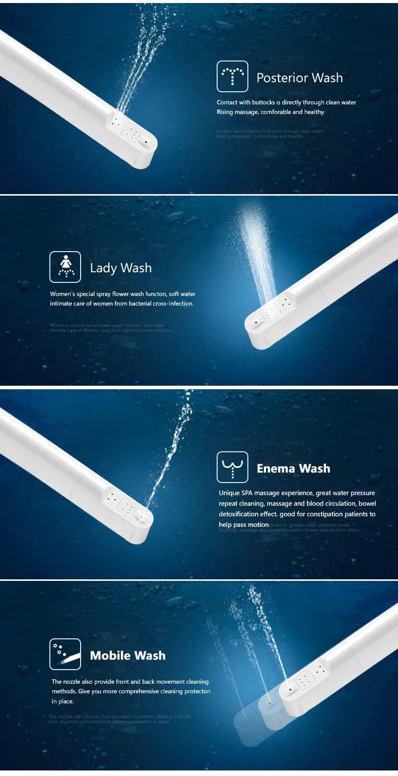 Пользователь должен сидеть на сидении, чтобы начать функцию стирки и сушки. 1. Задняя чистка: глубоко очищает складки ягодиц. Безопасная для здоровья стирка, 2. Женственная чистка: специальная широкая Форсунка и 5 струйных отверстий, мягкая вода для интимной заботы женщин. 3. Клизма: Турбо-стирка. Имеет сильную емкость для мытья, колонна струйной воды может быть введена в Анальный зад 3 сантиметра. Стимулирует анус. Увлажнение твердых фекалий, 4. Двигательная стирка: спа-массаж, очищение с помощью движения сопла вперед и назад. 5. Самоочищающее сопло: сопло выполняет процесс самоочистки каждый раз после программы стирки 6. Сушилка: обеспечивает поток теплого воздуха, чтобы высушить данную влажную область пользователя после очистки. 7. Дезодорант-дезодорант устраняет или уменьшает неприятные запахи при включении. 8. Энергосбережение: модель Eco. Только когда пользователь сидит на нем, продукт работает нормально. 9. Мягкий Ночной светильник: Встроенный светодиодный мерцающий свет, мягкий, теплый и удобный в темноте. 10. Регулировка давления воды: Нажмите HI/LO, чтобы изменить прочность воды. Регулировка положения сопла: Нажмите FR / BK для изменения положения удлинителя сопла. Регулировка температуры воды: комнатная температура, 34 ℃.37 ℃. 40 ℃. Регулировка температуры воздуха: Уровень 1: комнатная температура, уровень 2: 46 ℃. Уровень 3: 52 ℃. Уровень 4: 58 ℃. Температура сиденья: комнатная температура, 34 ℃.37 ℃. 40 ℃.