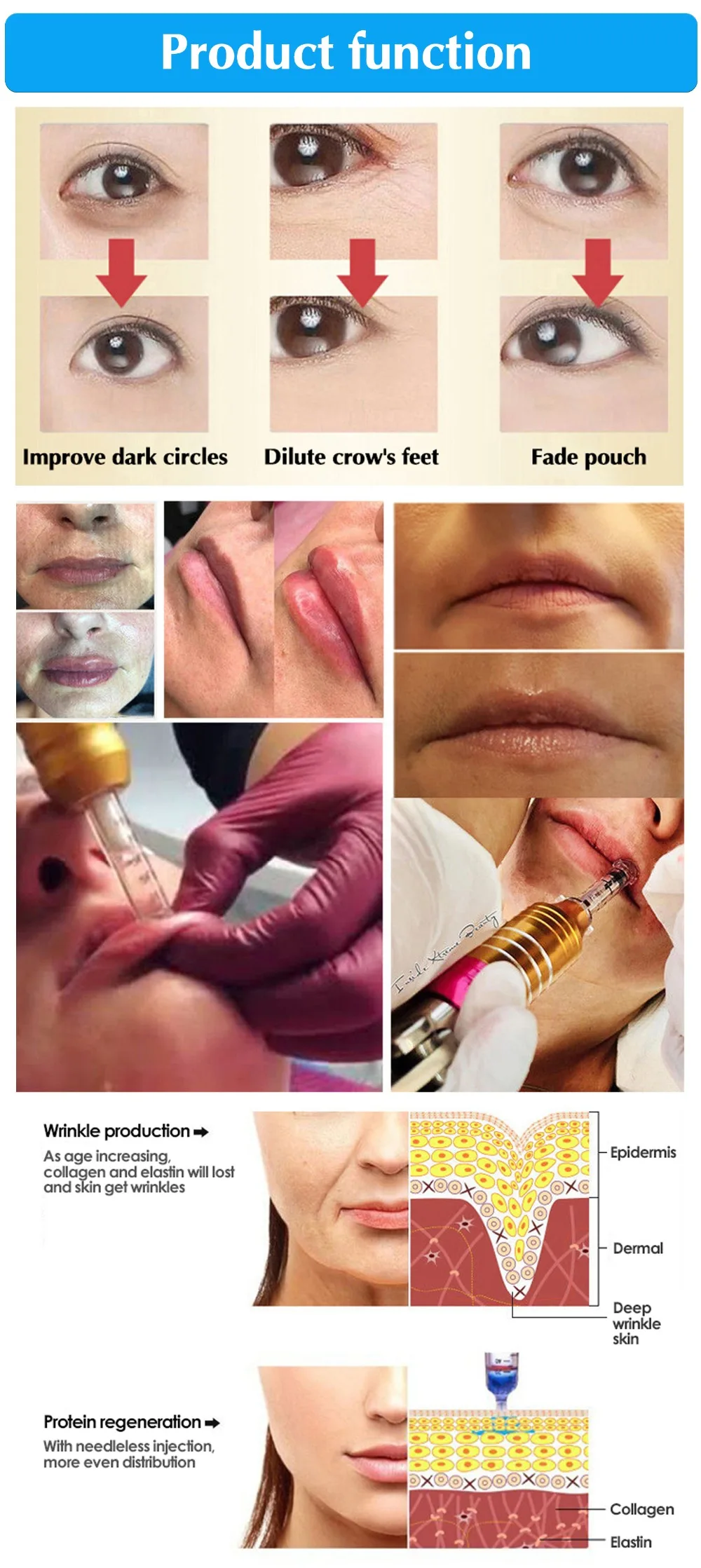 Что такое ручка гиалурона? Водная мезотерапия заключается в впрыскивании гиалуроновой кислоты в кожу. Гиалуроновая кислота содержит влагу, в 200-300 раз более богатая, чем тело. Благодаря чему кожа становится гладкой, мягкой, яркой и увлажненной после инъекций. Для того, чтобы сохранить кожу увлажненной, дамы всегда выбирают различные продукты по уходу за кожей. На самом деле, продукты по уходу за кожей только увлажняют влагу на cutin. Так что при размазывании эти продукты не могут глубоко обеспечить влагу для кожи. Как мы знаем, акне, морщинки и неэластичность появятся, если кожа не будет влагой. Водная мезотерапия решает все проблемы из-за отсутствия влаги, таких как шеллоидная кожа, цветовое пятно, морщинки... И он обеспечит влагу для дермы. Поэтому водная мезотерапия хорошо работает на отбеливании, увлажнении и обновлении неэластичности. Характеристики: Название продукта: ручка для инъекций гиалурона Материал: нержавеющая сталь 304 Особенности: морщинки, подтяжки лица, подтяжки кожи и т. Д. Особенности: -Помогает уменьшить пятна, морщины и следы. Функция подтягивания и наполнения -Увеличение уровня коллагена для создания новой и молодой кожи, что обеспечивает омоложение кожи. -Улучшает кожу, восстанавливает эластичность кожи, улучшает старение. -Может сделать Антивозрастные продукты попадают в глубину кожи, не повреждая кожу, без побочного эффекта, безопасно для использования. -Глубокое Пополнение и богатое питание, укрепляет кожу, чтобы впитать продукт красоты. -Он используется для более чем 10000 инъекций, и Он управляется самоприводной пружиной. -Быстрая инъекция менее 1/3 секунды, микро отверстие и автоматическое пружинное давление делают инъекции безопасными и безболезненными -Удалите меланин в теле, улучшите темную и желтую кожу, сделайте кожу яркой и белой.
