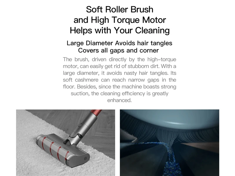 Мягкий валик и двигатель с высоким крутящим моментом Помогает с вашей очисткой Большой диаметр позволяет избежать запутывания волос Покрывает все зазоры и углы Щетка, управляемая непосредственно двигателем с высоким крутящим моментом, может легко избавиться от упрямой грязи. Большой диаметр позволяет избежать неприятных запутывания волос. Мягкий кашемир может достигать узких зазоров в полу. Кроме того, так как машина может похвастаться сильным всасыванием, эффективность очистки значительно улучшается.