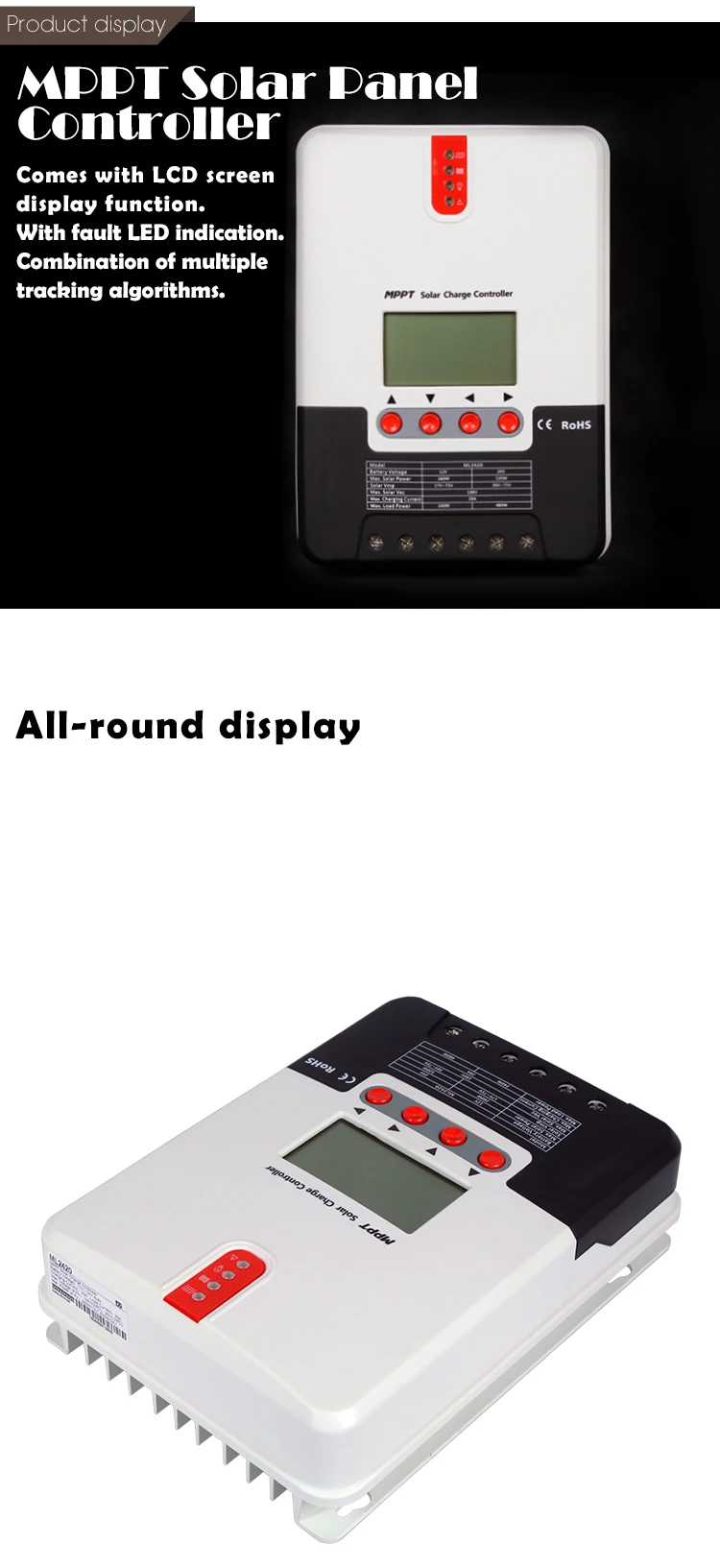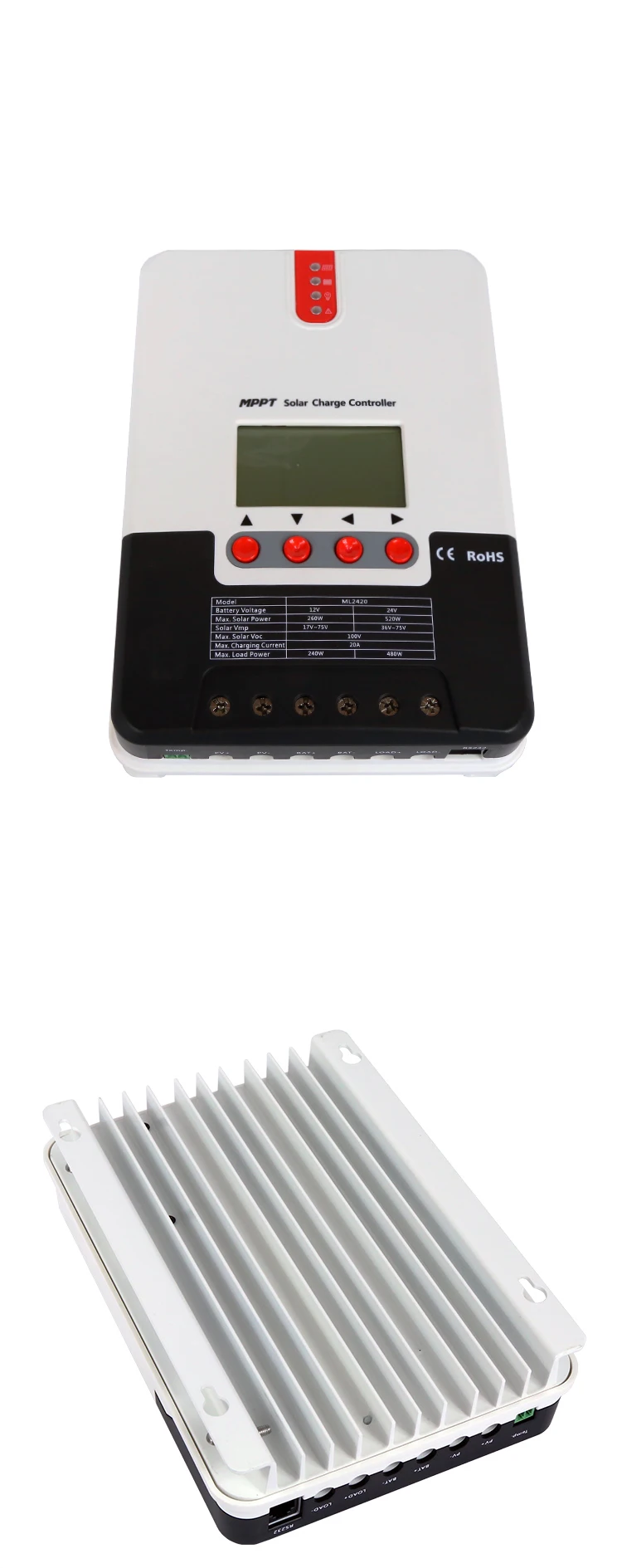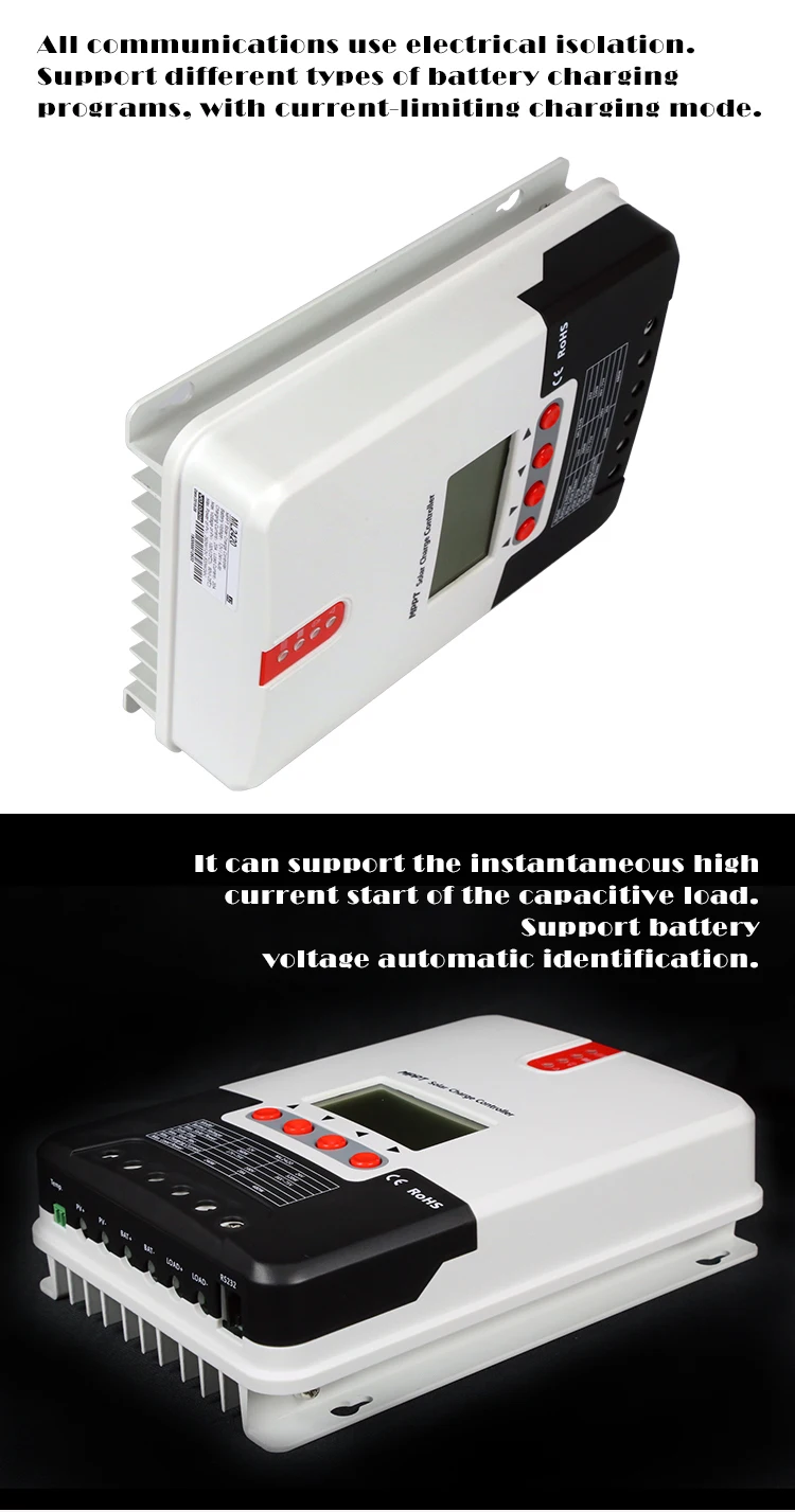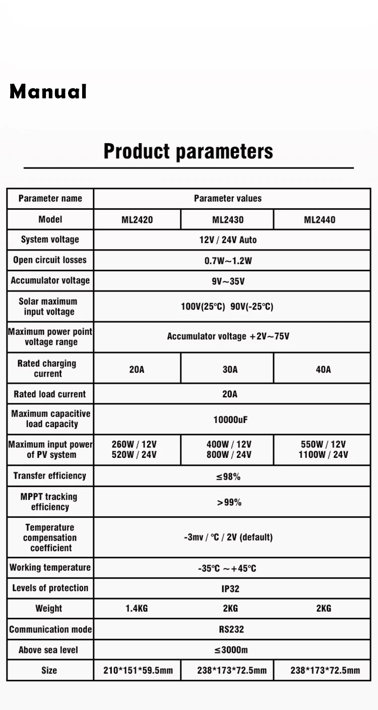 Презентация продукта 1. усовершенствованная технология отслеживания с двумя пиками или несколькими пиками, встроенный алгоритм отслеживания максимальной мощности, позволяет значительно повысить энергоэффективность фотоэлектрических систем, что примерно на 15% ~ 20% выше, чем традиционная эффективность зарядки ШИМ. 2. Сочетание нескольких алгоритмов отслеживания может точно отслеживать рабочие точки кривой I-V за очень короткое время. 3. Эффективность отслеживания MPPT до 99.9%. Эффективность контурного преобразования энергии достигает 98%. 4. Поддержка различных типов процедур зарядки аккумулятора, с режимом ограничения тока зарядки. 5. Он может поддерживать мгновенный высокий ток запуска емкостной нагрузки. Поддержка напряжения батареи Автоматическая идентификация. 6. Светодиодный индикатор неисправности и ЖК-дисплей аномальной информации, удобно для пользователей, чтобы определить Сбой системы. 7. Поддержка хранения данных в течение 1 года. 8. Со встроенной функцией ЖК-дисплея вы можете просматривать рабочие данные и статус оборудования, а также поддерживать изменение параметров контроллера. 9. Поддерживает стандартный протокол MODBUS для удовлетворения потребностей связи в различных случаях. 10. Все коммуникации электрически изолированы, пожалуйста, будьте уверены. 11. Встроенный механизм защиты от перегрева может эффективно уменьшить рост температуры контроллера и избежать повреждения при высокой температуре контроллера. 12, с функцией выборки внешнего напряжения аккумулятора. С функцией компенсации температуры, автоматически Отрегулируйте параметры заряда и разряда для улучшения срока службы батареи. 13, с функцией защиты от перегрева батареи, температура внешнего аккумулятора превышает установленное значение, закроет заряд и разрядку, чтобы не повредить оборудование из-за чрезмерной температуры. 4. Защита от молнии для телевизоров. Параметры продукта ML2420 Вес: 1400 г Размер: 210*151*59,5 мм ML2430 Вес: 2000 г Размер: 238*173*72,5 мм ML2440 Вес: 2000 г Размер: 238*173*72,5 мм ML4860 Вес: 3600 г Размер: 282*205*93 мм Применение метод 1. Выберите место установки: Избегайте установки контроллера при прямых солнечных лучах, высокой температуре и легкой воде, и убедитесь, что контроллер хорошо проветривается. 2. Крепежные винты: сначала поместите направляющую панель в подходящее положение, затем отметьте положение установки ручкой, Просверлите 4 подходящих монтажных отверстия в каждой отметке, и зафиксируйте винты. 3. Исправьте контроллер: выровняйте крепежные отверстия контроллера с четырьмя винтами, которые зафиксированы заранее и повесьте их. 4. Проводка: сначала снимите два винта на верхней панели контроллера, а затем начните проводку. На что следует обратить внимание 1. Опасность высокого напряжения! Фотоэлектрические массивы могут генерировать очень высокие напряжения в открытой цепи. Отсоедините автоматические выключатели или предохранители перед проводкой. Будьте осторожны во время проводки. 2. При установке контроллера убедитесь, что достаточно воздуха проходит через теплоотвод контроллера, и оставьте по крайней мере 150 мм пространство выше и ниже контроллера, чтобы обеспечить естественную конвекцию тепловыделения. При установке в закрытом ящике обеспечить надежное отведение тепла через коробку.