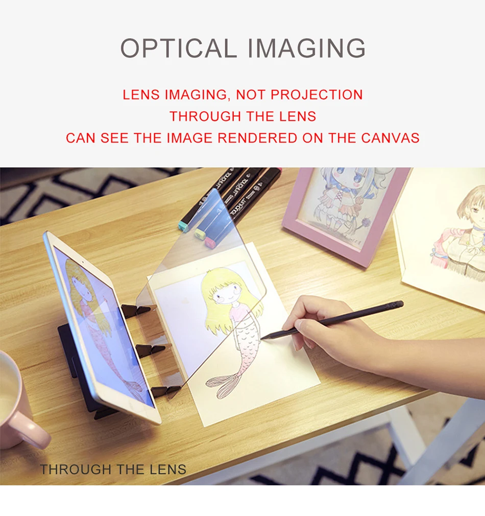Параметры: Подходит для: детей, взрослых, учителей, начинающих художников Размер продукта: 20,2*13,5 см Материал: пластик Особенности: 1. Принцип оптической визуализации: линза не является проекцией, а наблюдением через объектив, вы можете увидеть изображение на холсте. 2. Материал: оптическое покрытие полиметилметакрилат линзы АБС пластик, прочный. 3. Поддержка мобильных телефонов и планшетов-Вам нужно скачать приложение оптического рисования, положить телефон на полку, и тогда вы можете начать рисовать без необходимости в рисование. 4. Образование: помогает развить зрительно-ручную координацию и базовые навыки рисования. Упаковочный лист: 1 x доска для рисования Зажим-1 шт.