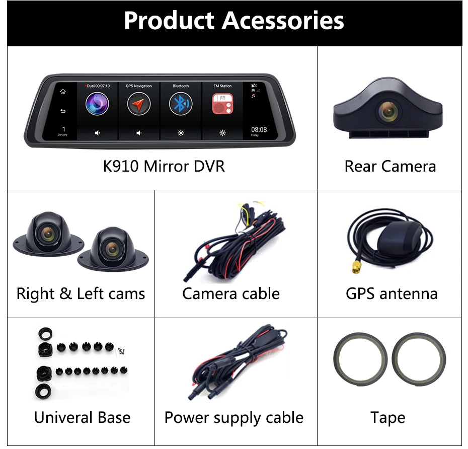 За исключением одновременной записи передней и задней камеры, dashcam также оснащается еще одним левым и правым объективом для слепых зон, это время, чтобы попрощаться с слепой зоной вождения, обеспечить безопасную парковку и вождение автомобиля.