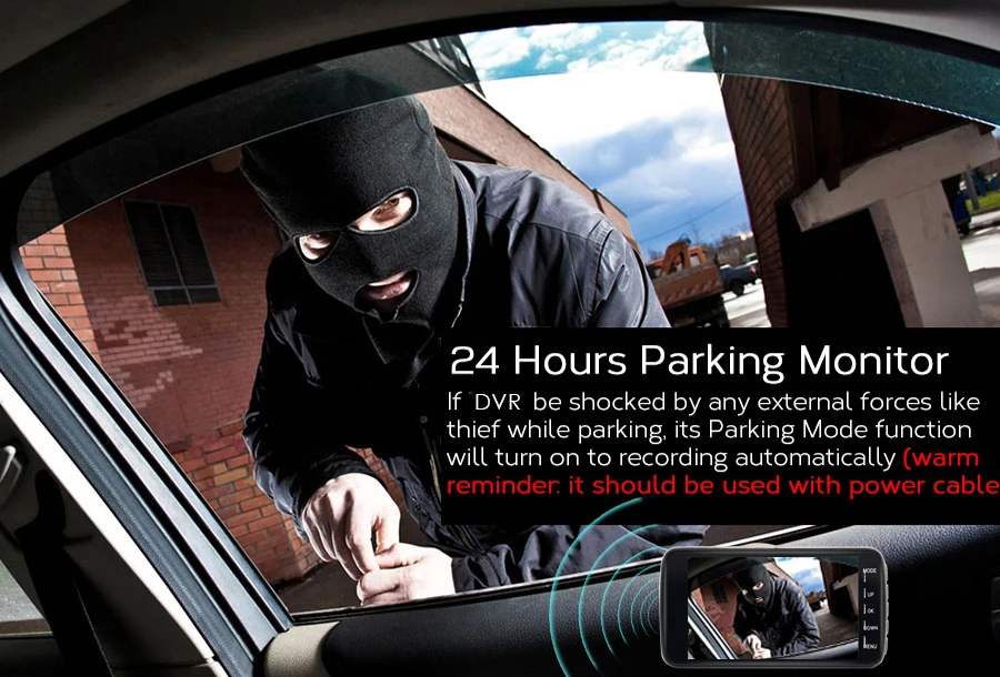 Когда кто-то рядом с вашим автомобилем или автомобилем начинает двигаться, автоматически включается и начинает запись при обнаружении любого удара или столкновения, устройство автоматически записывает в течение нескольких секунд, убедитесь, что 24hr парковочная защита.