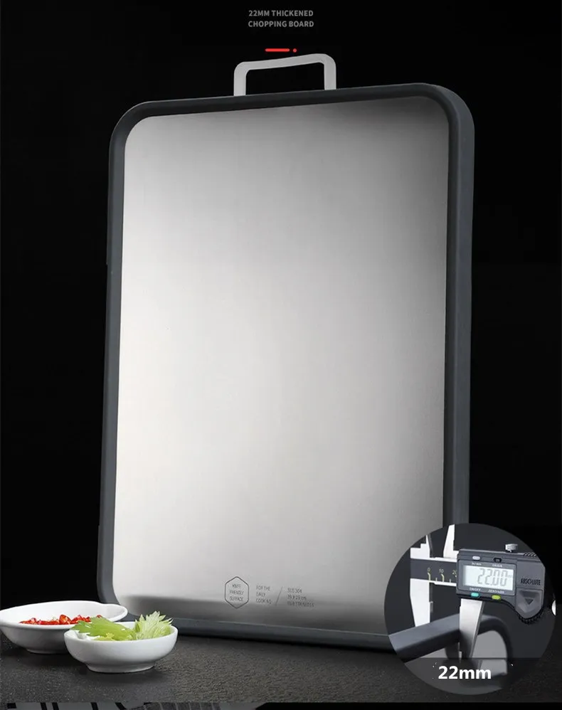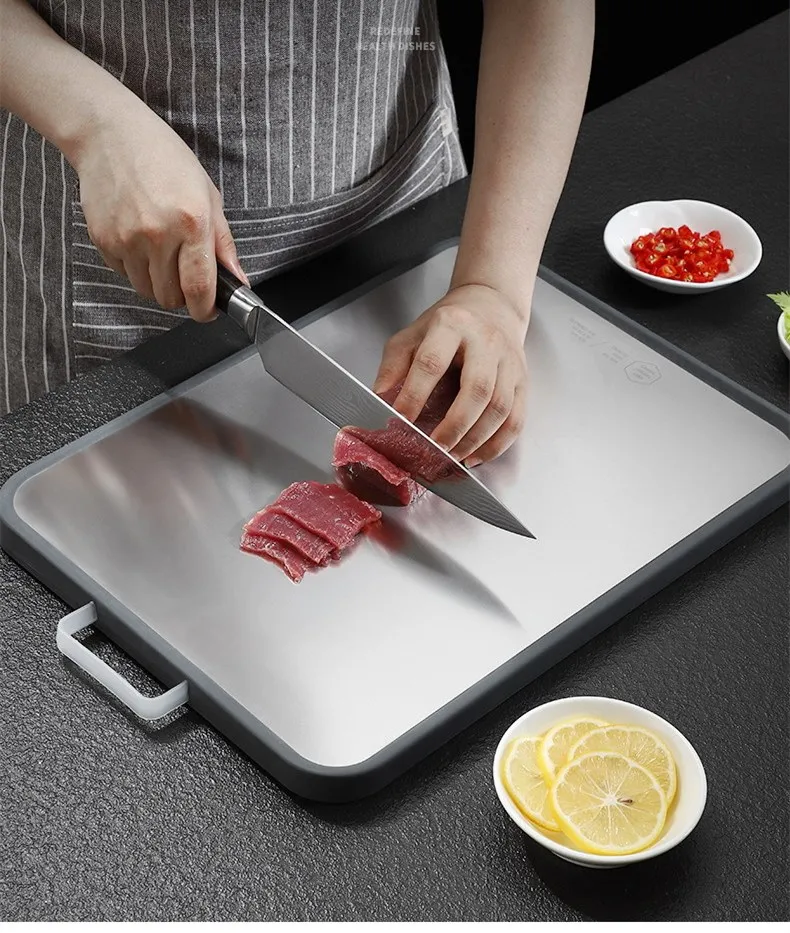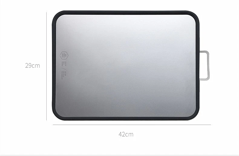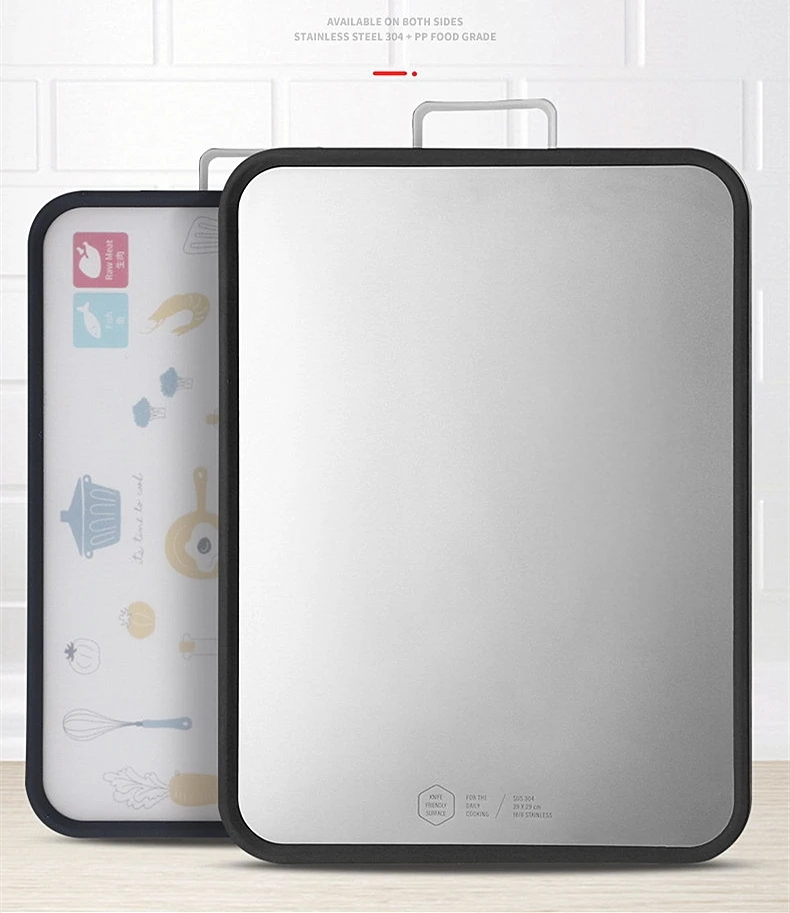 1. Это двухсторонняя разделочная доска с 304 нержавеющей сталью с одной стороны и пластиком с другой. 2. Наклонная конструкция позволяет воде течь в одном направлении. Окруженный TPR резиной, он не скользит и не шумит. 3. Дизайн ручки, можно повесить на стену, когда не используется.