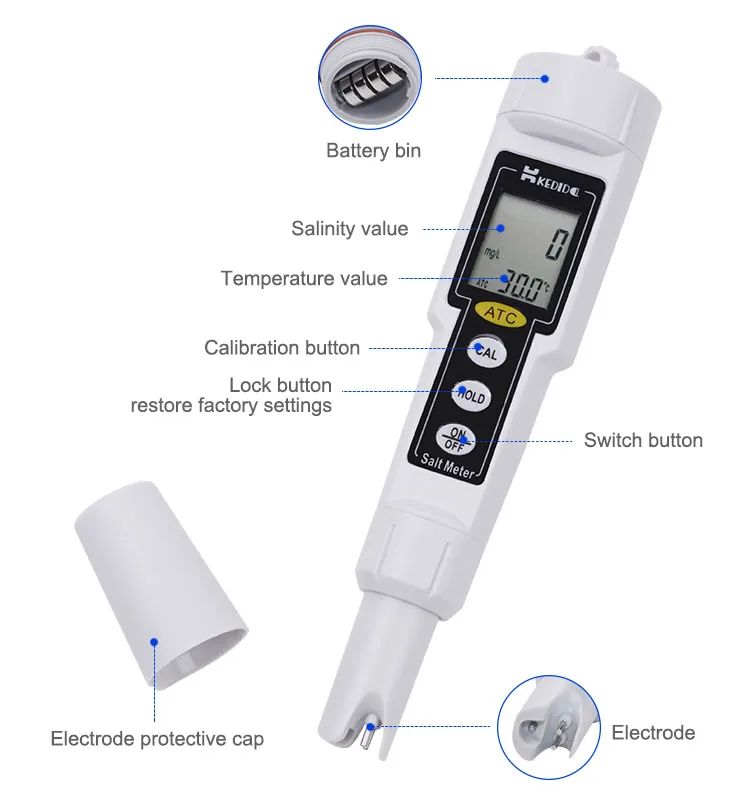 Этот компактный водостойкий тестер солености/измеритель. Широкий спектр применений, включая аквариум с соленой водой, плотину, речную и скважинную воду, напитки и пищевую обработку, рыбные hatcheries, фотографии, лаборатории, школы и колледжи и другие испытания содержания соли в воде.