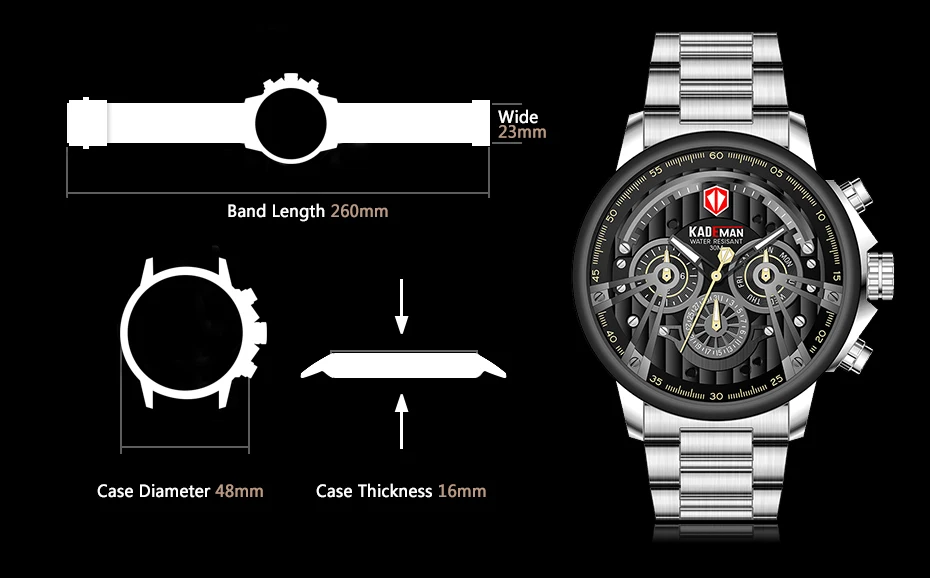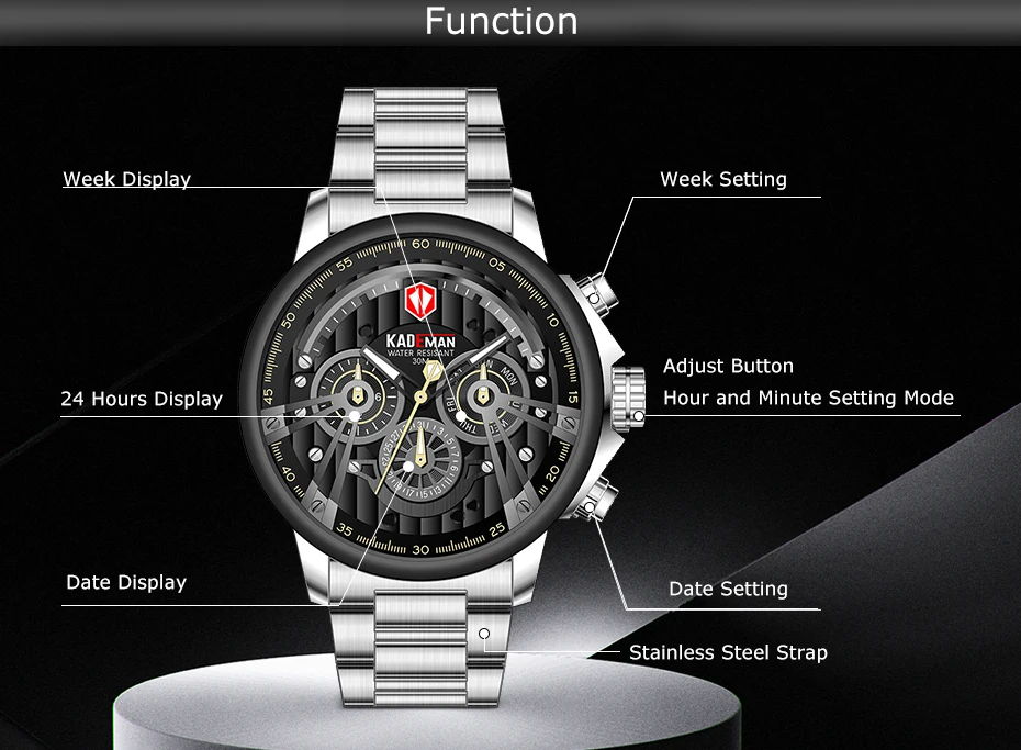 -Автоматическая Дата, отображение недели, водонепроницаемость, задний светильник, ударопрочность,