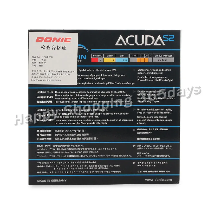 - Donic Acuda S2 is a very fast rubber with outstanding spin qualities. Close to or away from the table it is possible to play "loop-loop" as in the days of speed glued rubbers. - Basic character: spin-focused, high precision fast rubber. Player's style: aggressive, first ball attack, close to the table. Style: Loop/fast attack Pimples: Pips-in Hardness: Medium Soft Thickness: Max
