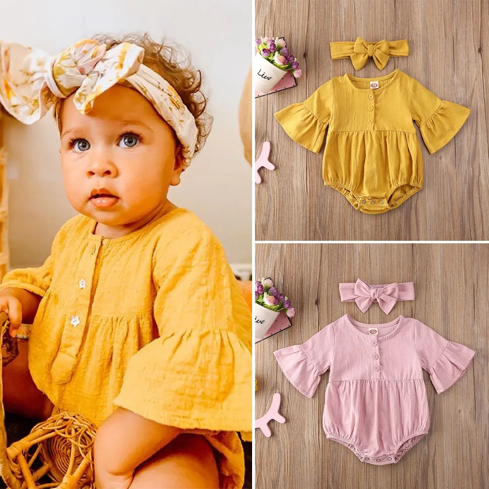 Бесплатная доставка; Одежда для новорожденных девочек; боди с расклешенными рукавами, пуговицами и круглым вырезом; однотонная повязка на голову с бантом; комплект из 2 предметов для малышей