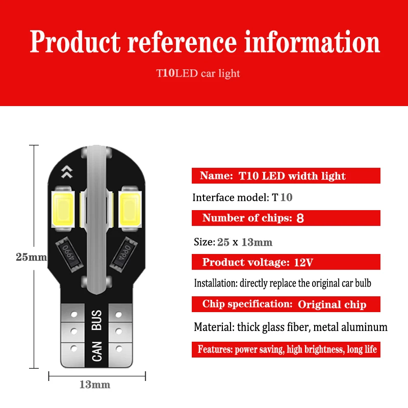 Материал: светодиодный светильник Светильник Цвет: белый светильник Тип розетки: T10 Светодиодный Тип: 5730 Количество светодиодов: 8 Напряжение: DC12V Цветовая температура: 6500K Мощность: 3 Вт Световой поток: 180LM Область применения: ширина освещения, освещение для чтения, отсек, огни, дверные огни, инструмент, огни номерных знаков