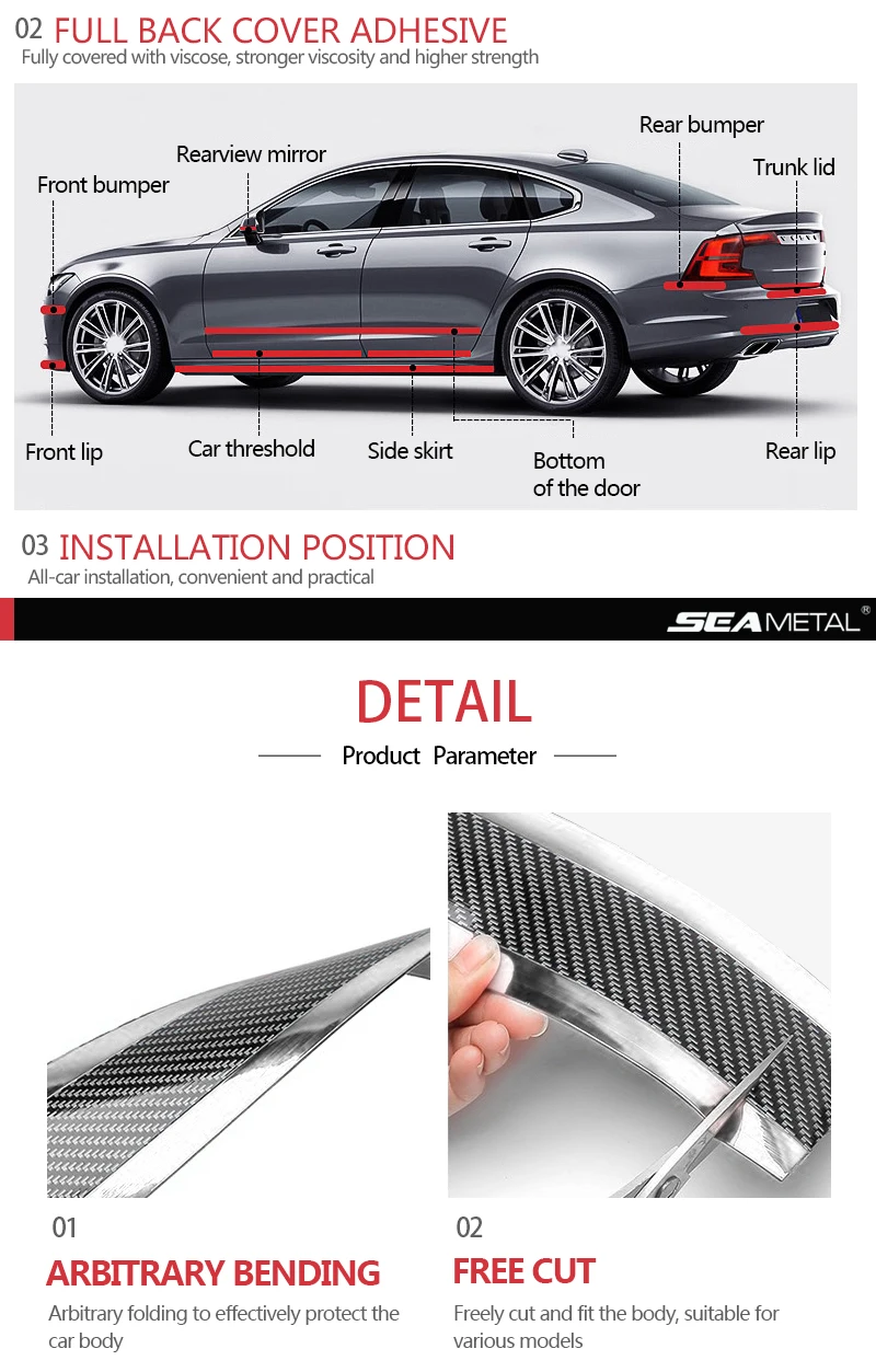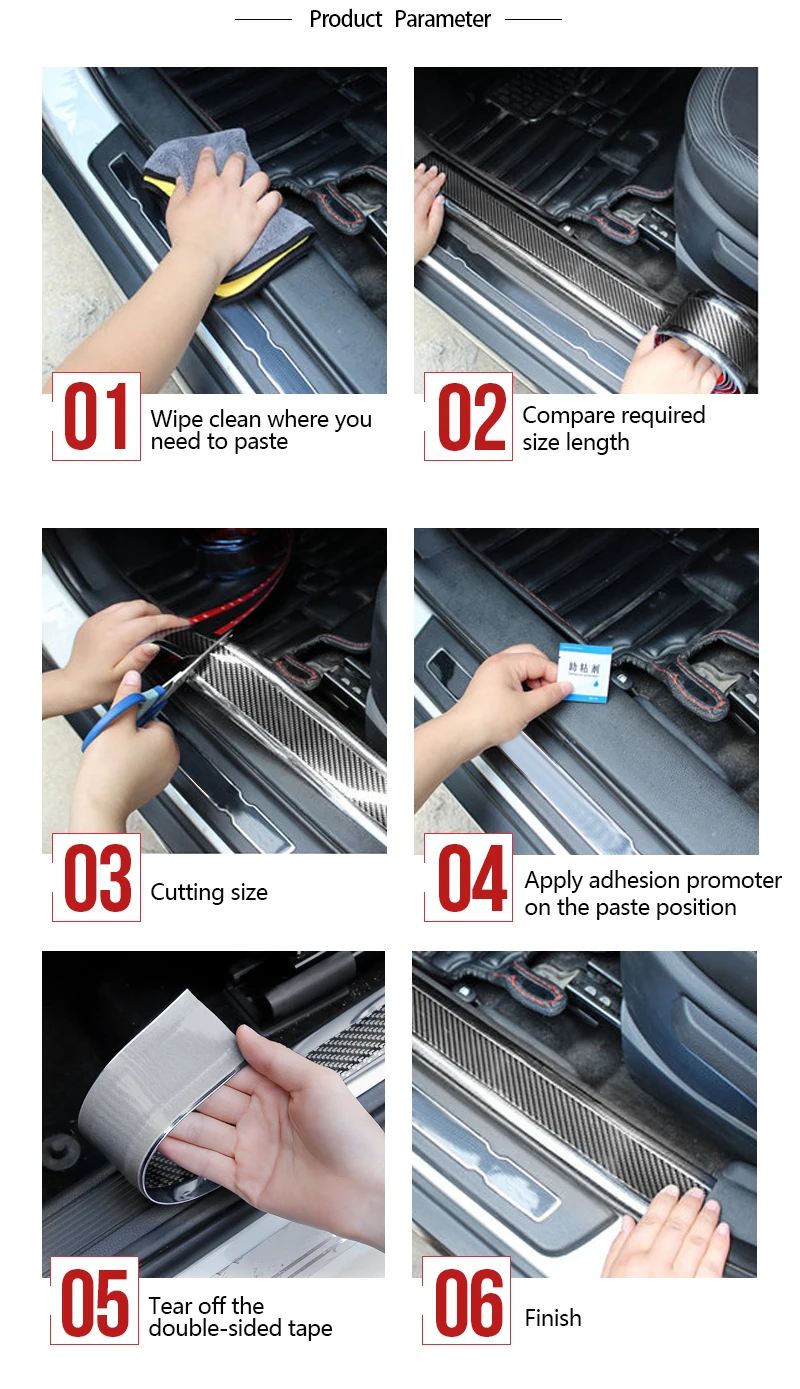 1. Водонепроницаемый, легкий в уходе. 2. Установка простая, удобная и быстрая. 3. Защитите свой автомобиль, чтобы не поцарапать. 4. Подходит для большинства автомобилей и может быть вырезан.